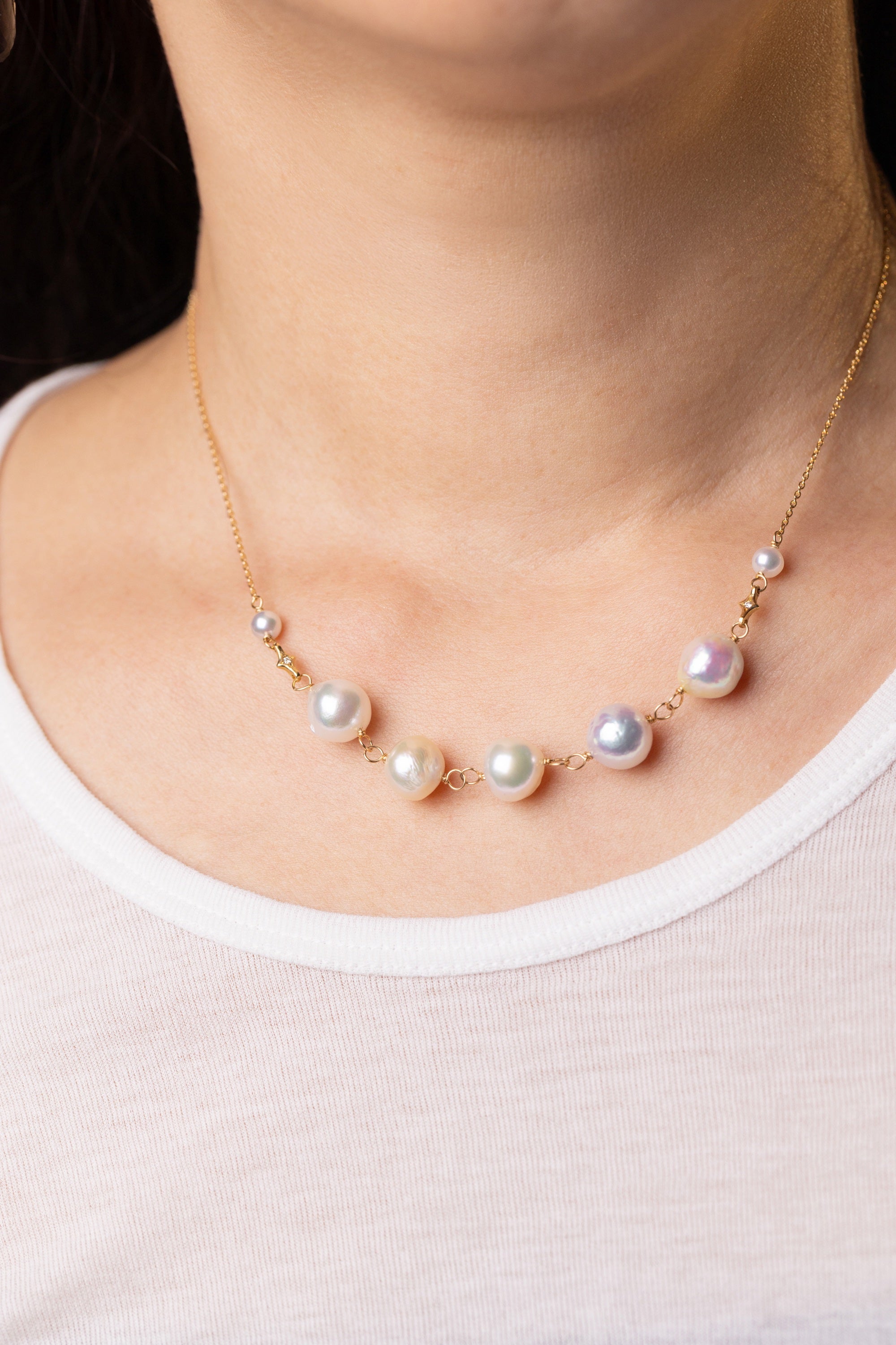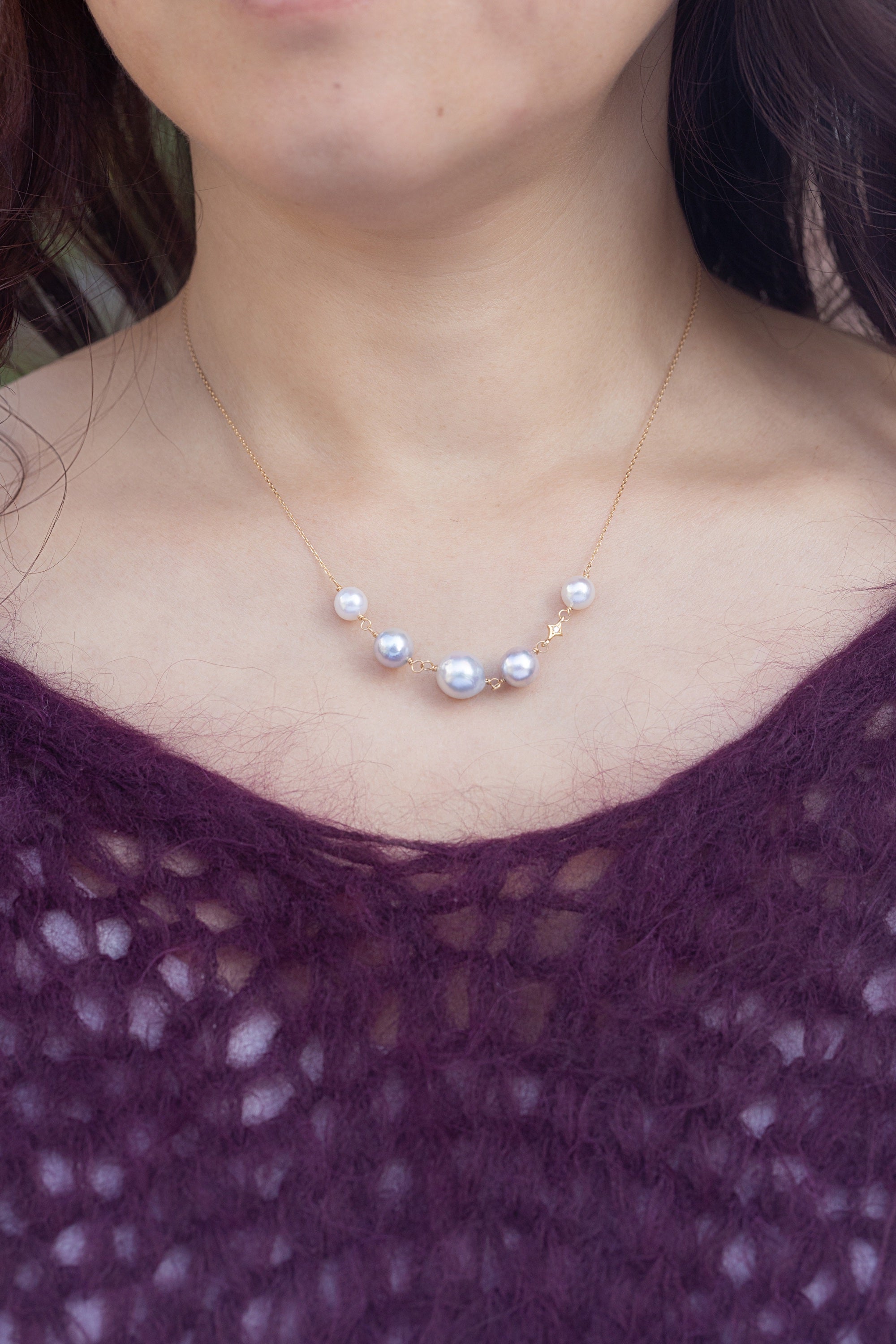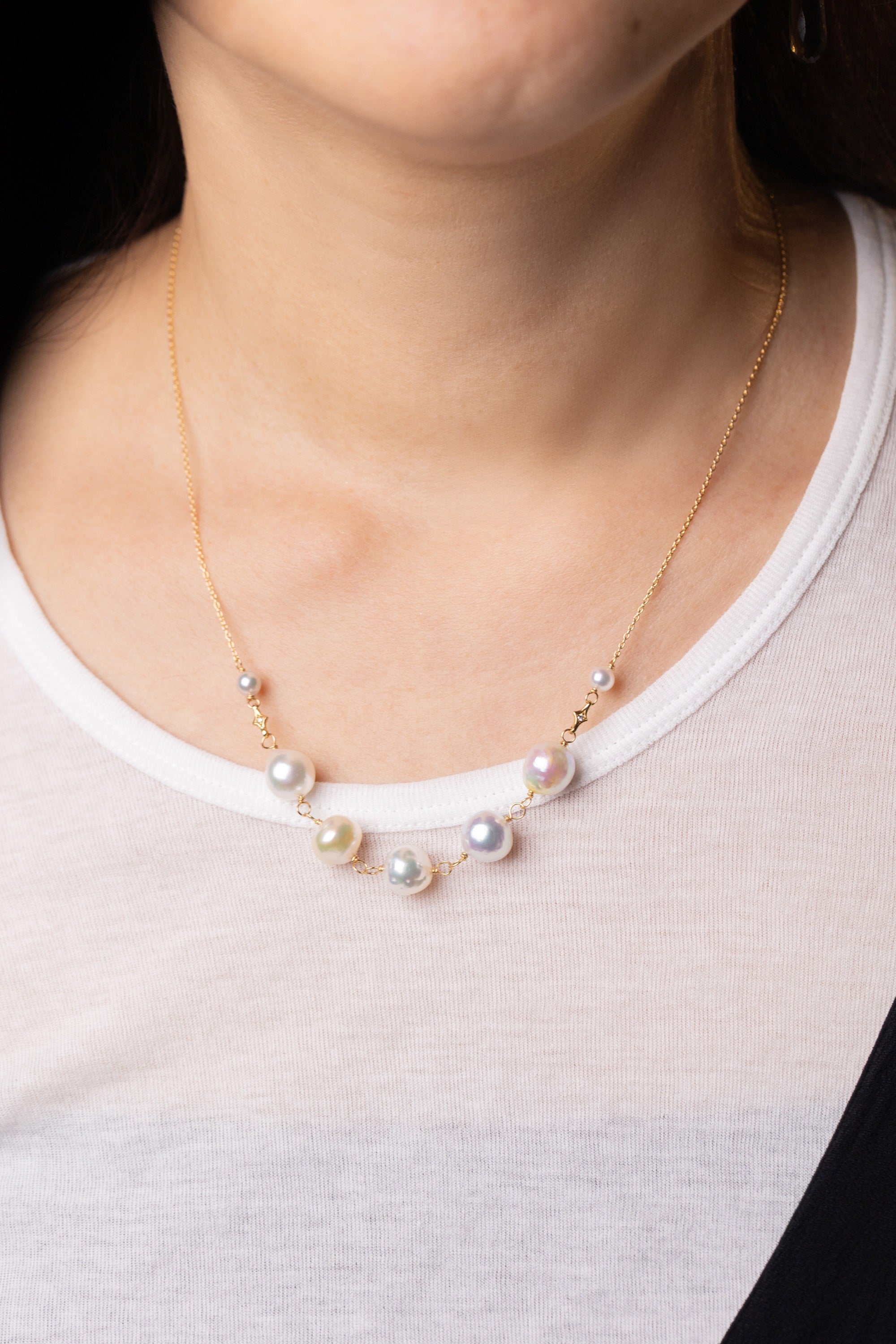 ナチュラルなアコヤ真珠が織りなす、優しい色合いが魅力のネックレスです。黄色やグレー、淡いピンクや青みがかった真珠を厳選し、自然な美しさをそのまま楽しめるデザインに仕上げました。シンプルながらも存在感のあるネックレスは、さまざまなコーディネートに寄り添います。お揃いのアコヤのピアスと合わせることで、さらに特別感をプラスできます。