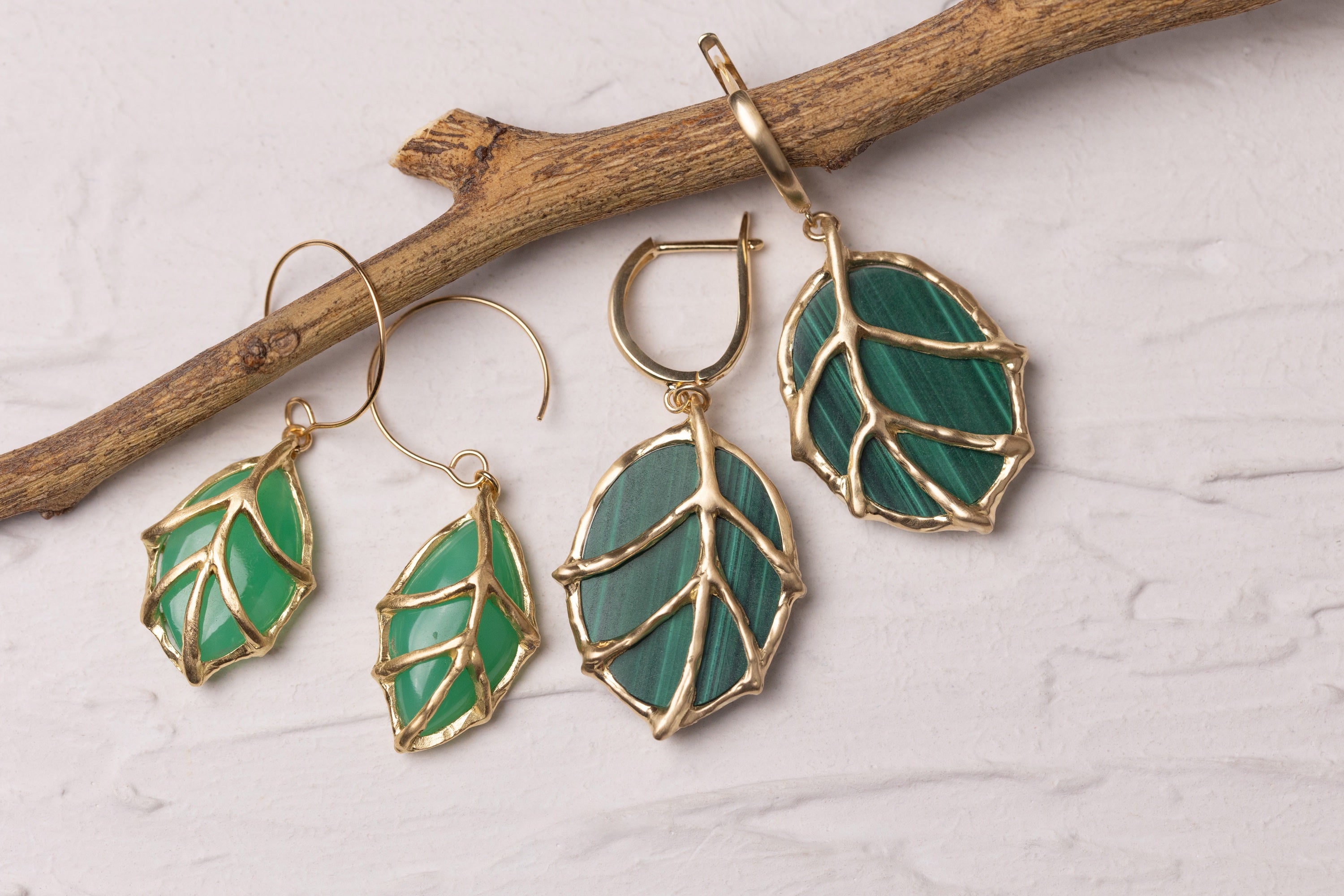 マラカイトの縦縞は、一枚の葉っぱの中に刻まれた年輪のよう。緑の部分が光に透けると、耳元に小さな森が宿るような気配を見せてくれます。