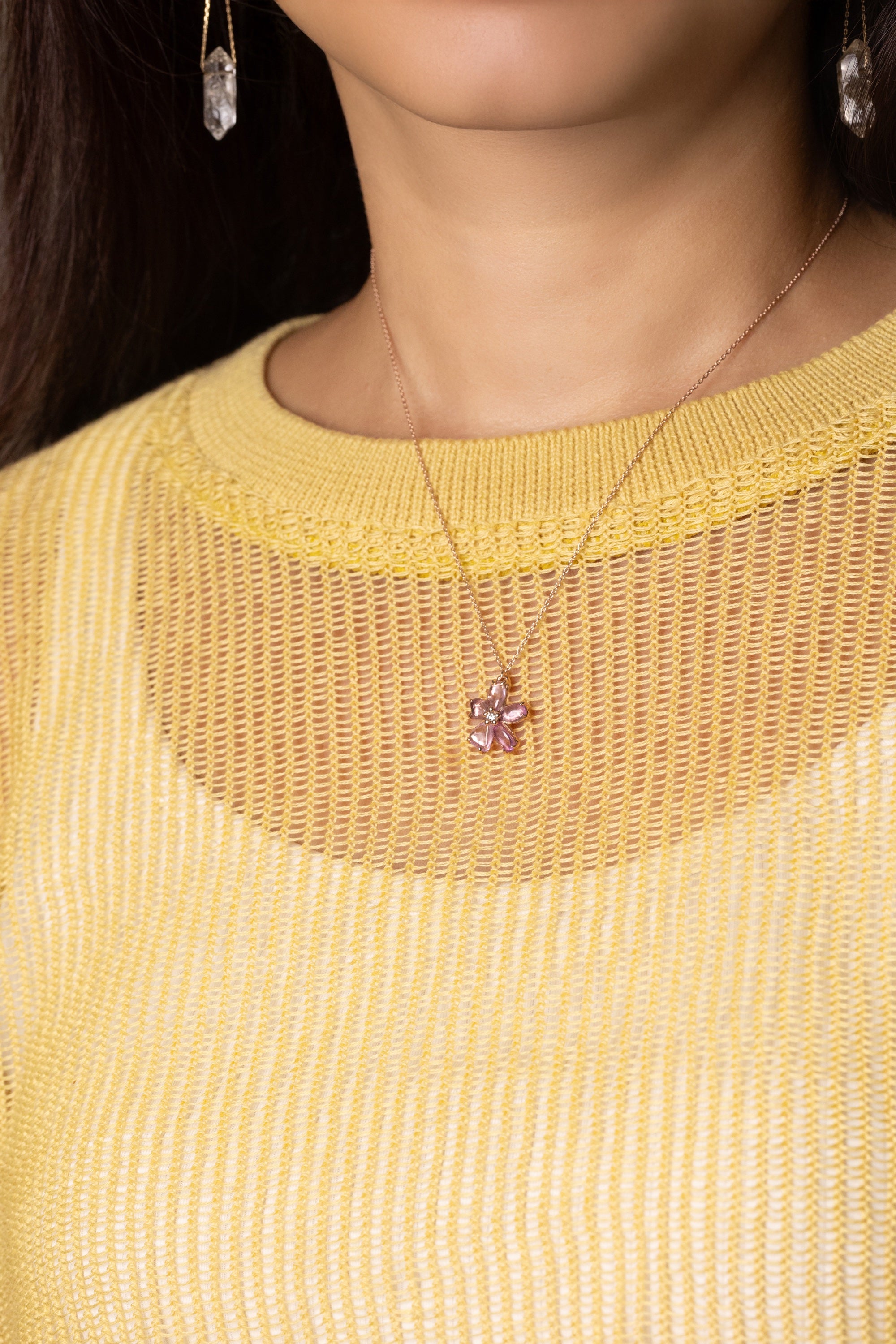 5枚のピンクサファイアで形づくった桜の花。その中心にダイヤモンドがきらりと光る、ピンクゴールドのネックレスです。
