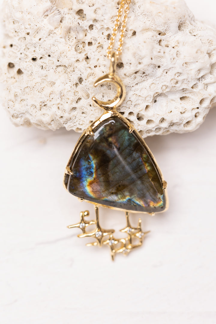 フィンランド産の大きな「スペクトロライト」を18金イエローゴールドの枠とチェーン、三日月と星団に合わせました。オーロラが広がるような石と星と月。胸元に小さな絵をのせるようなネックレスです。石は十分な大きさがあり、場所によって遊色効果の違いがすぐにわかります。自然の不思議と美しさをジュエリーにまとめたアイテムです。