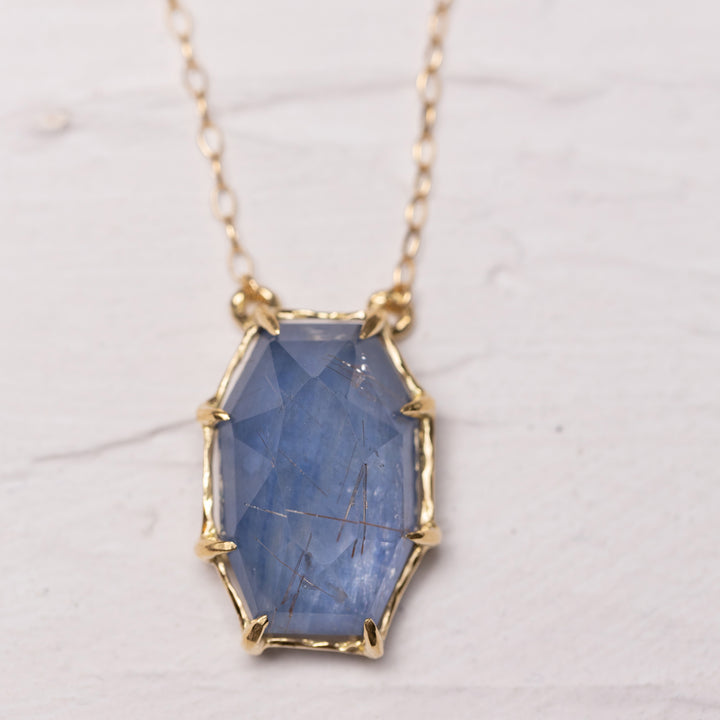 紫がかかったブルーの石「カイヤナイト」の上にルチルクオーツを貼り合わせました。 陽が沈んで、真っ暗になるまでの黄昏時、夕闇の空の色のようです。隙間があり軽やかな印象のチェーンには、夕闇に見え始める星に見立ててダイヤがあしらわれた星屑のモチーフが添えられています。石の形に合わせ、斜めに伸びるようにつけられたチェーン。デコルテにフィットするように落ち、涼やかな色を添えてくれます。薄い紫色は、合わせる色を選ばない色。夏には涼やかに、冬にはふんわりと優しい雰囲気に表情を変え、コーディネイトに彩りを落とします。