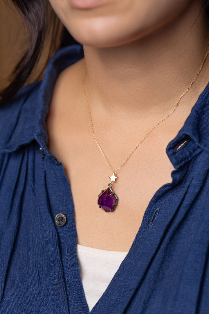 大胆にカットされたアメジストが、星から輝きながら揺れるようにデザインされたネックレス。大きなファセットが生み出す光の反射は個性的で、ひと目見た瞬間にその存在感が伝わります。 深い紫のによく合う、18金イエローゴールドのマットな色。はっきりとした色が美しい、アメジストのネックレスです。石を囲むのは、燻し加工をしたシルバー。ヴァイオレットとゴールドの組み合わせが作る華やかさを少しおさえ、さりげなく着けられるカジュアル感を残しました。 裏側はMayaらしい「Arabesque(アラベスク)」を変形させてかたどったもの。身に着ける人だけがわかる、小さな楽しみです。