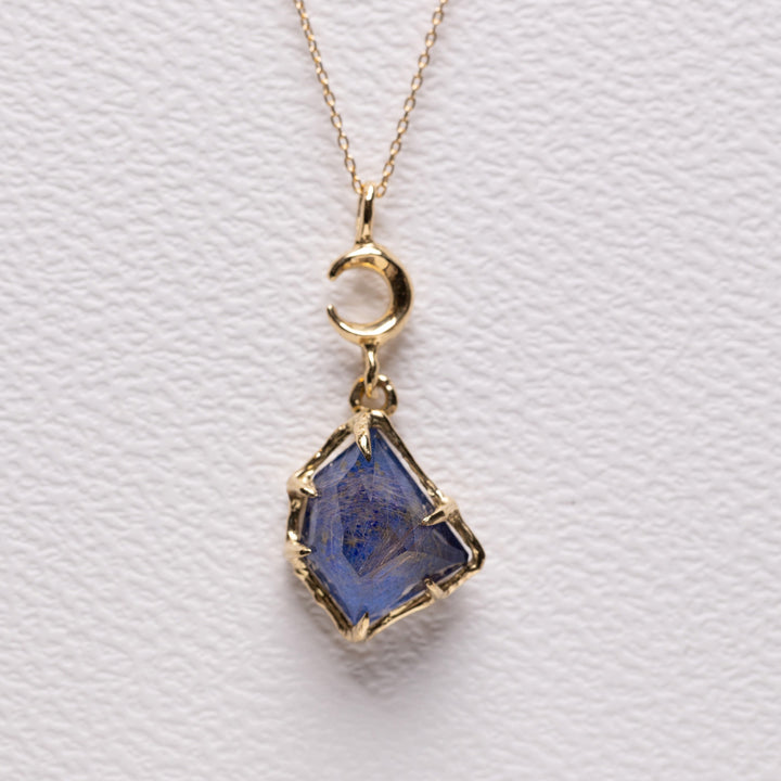 くるんとした弧を描く小さな三日月の下に、空のかけらが下がるネックレス。澄みきった空気が感じられるような空の色、ミッドナイトブルーのラピスラズリをスライスして、その上に高さのある立体的なルチルクオーツをのせています。透明度が高く、きらきらと光るルチル。ブルーのベースにゴールドのラインが映え、小さなかけらの中に、空の遠さ、深さを作っています。ラピスラズリは12月の誕生石のひとつです。