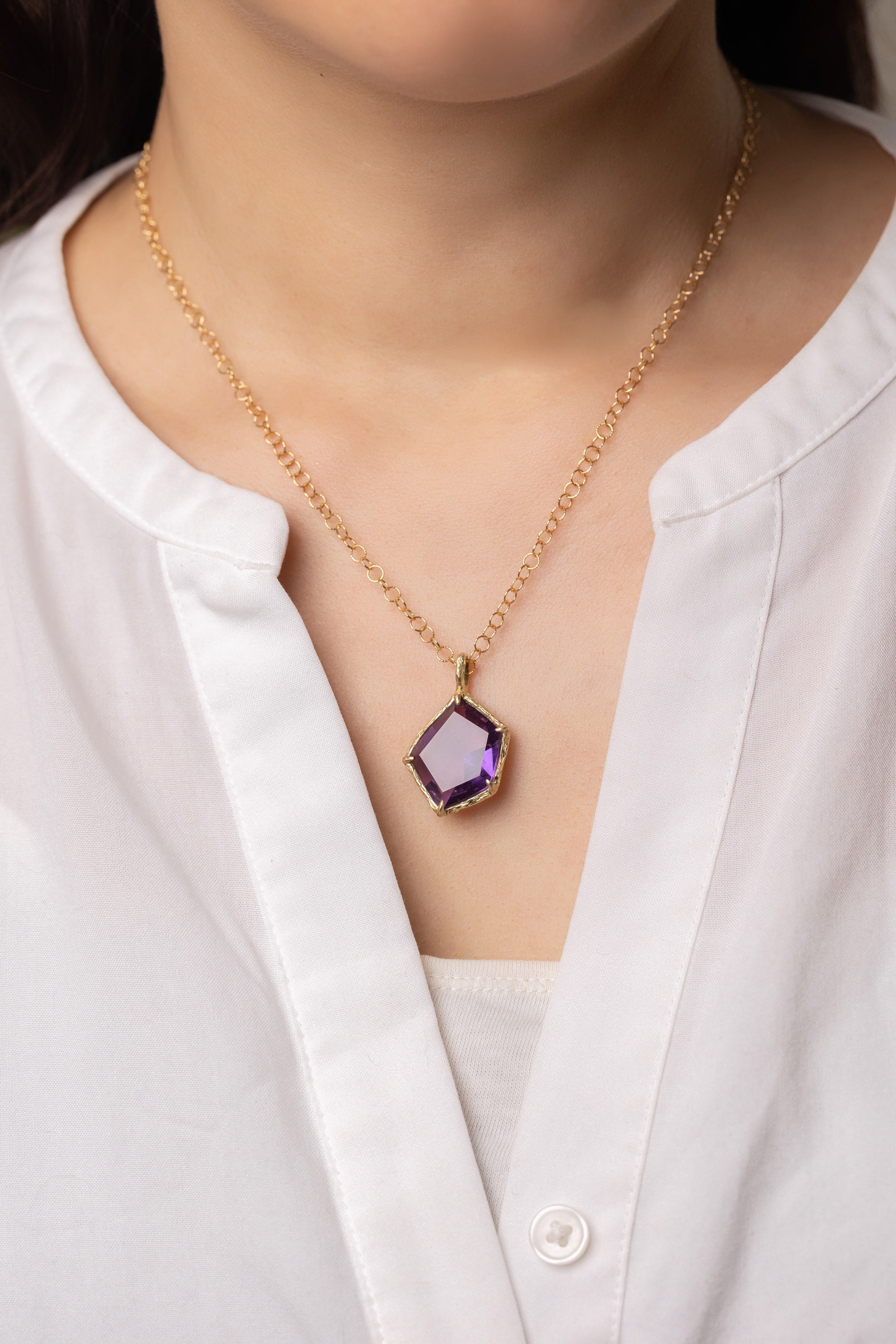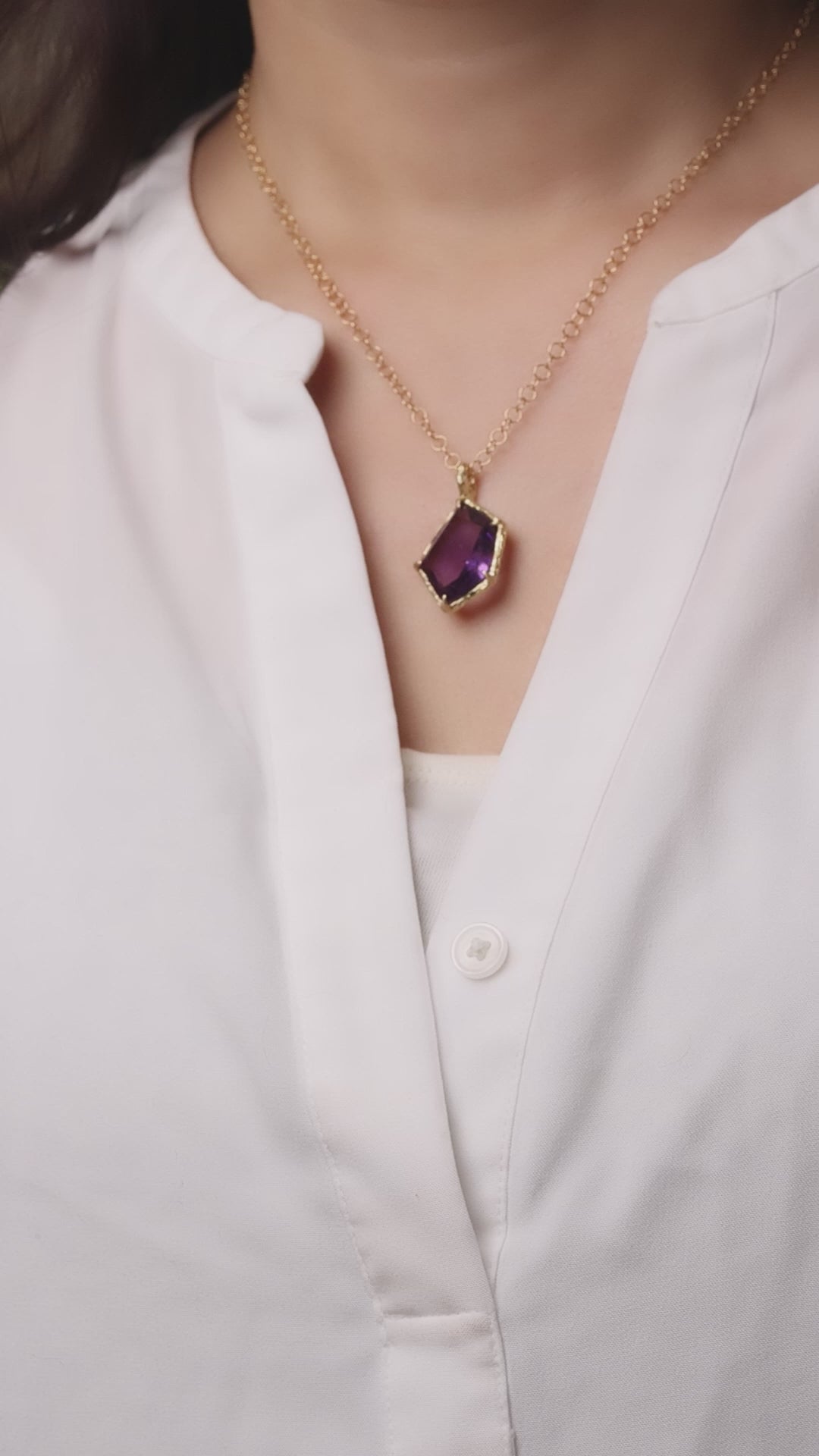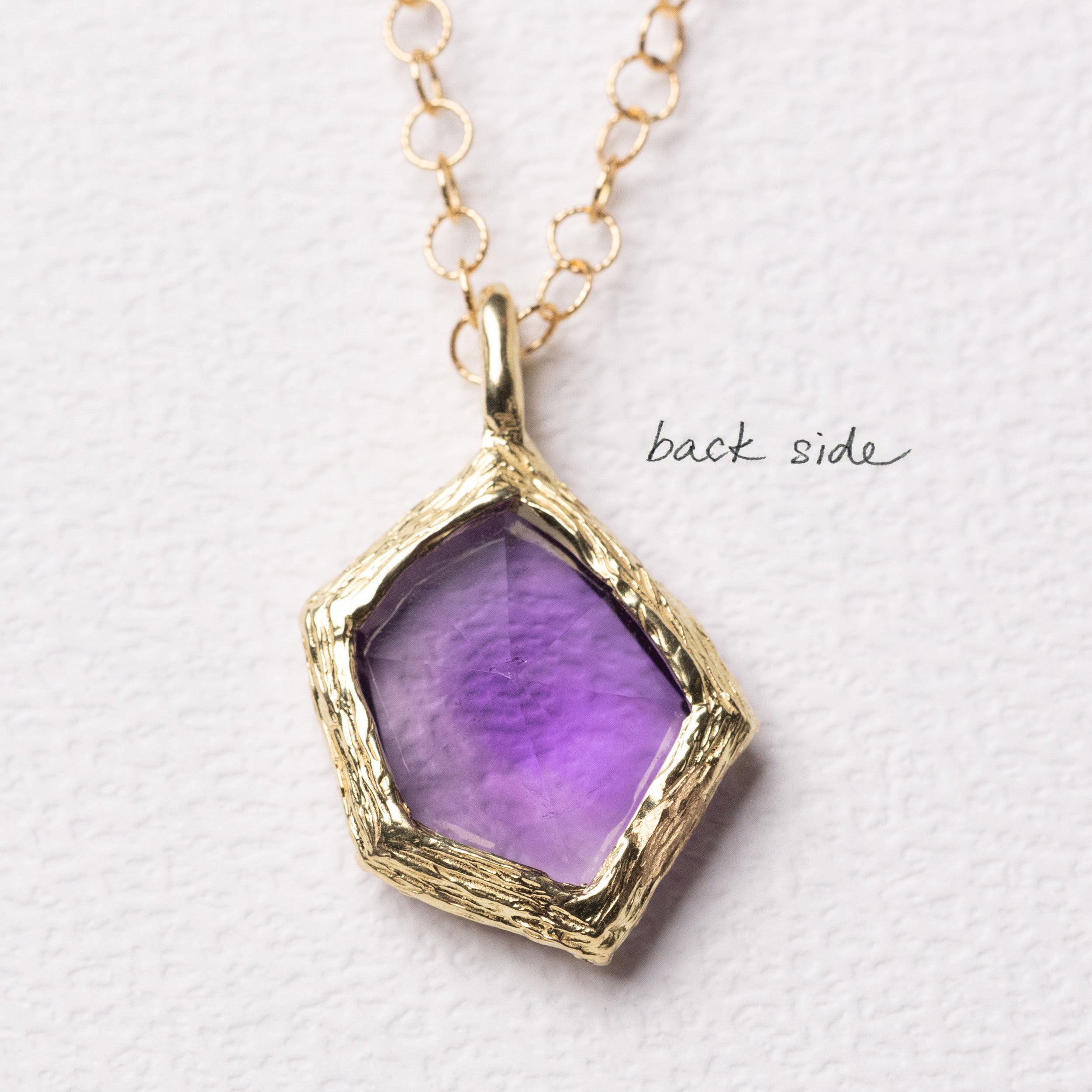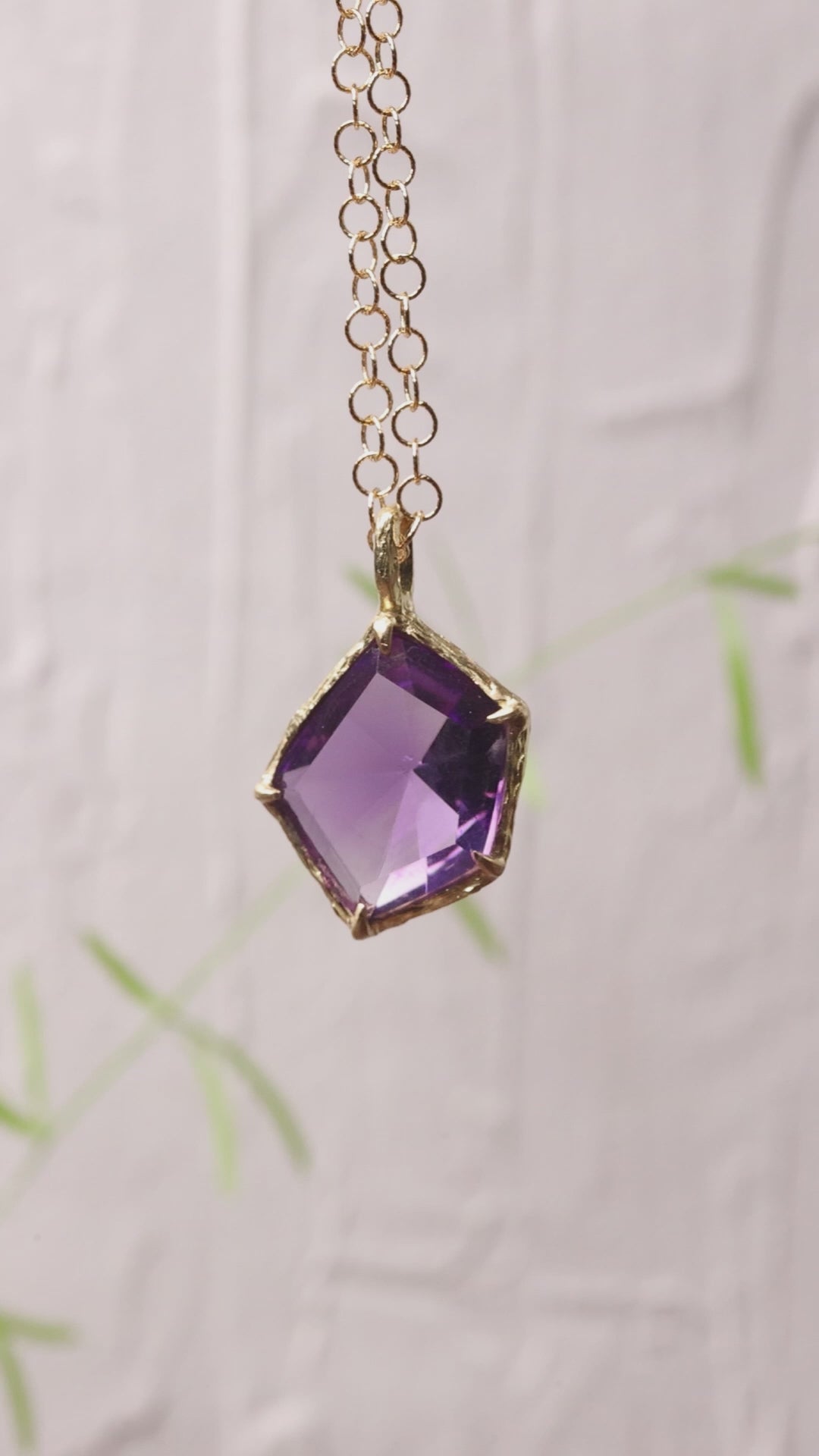 大きなファセットでカットされた、自然に伸びたようなフォルムのアメジストを、枝のテクスチャーのフレームに包み、やわらかく主張するチェーンで仕立てたネックレスです。