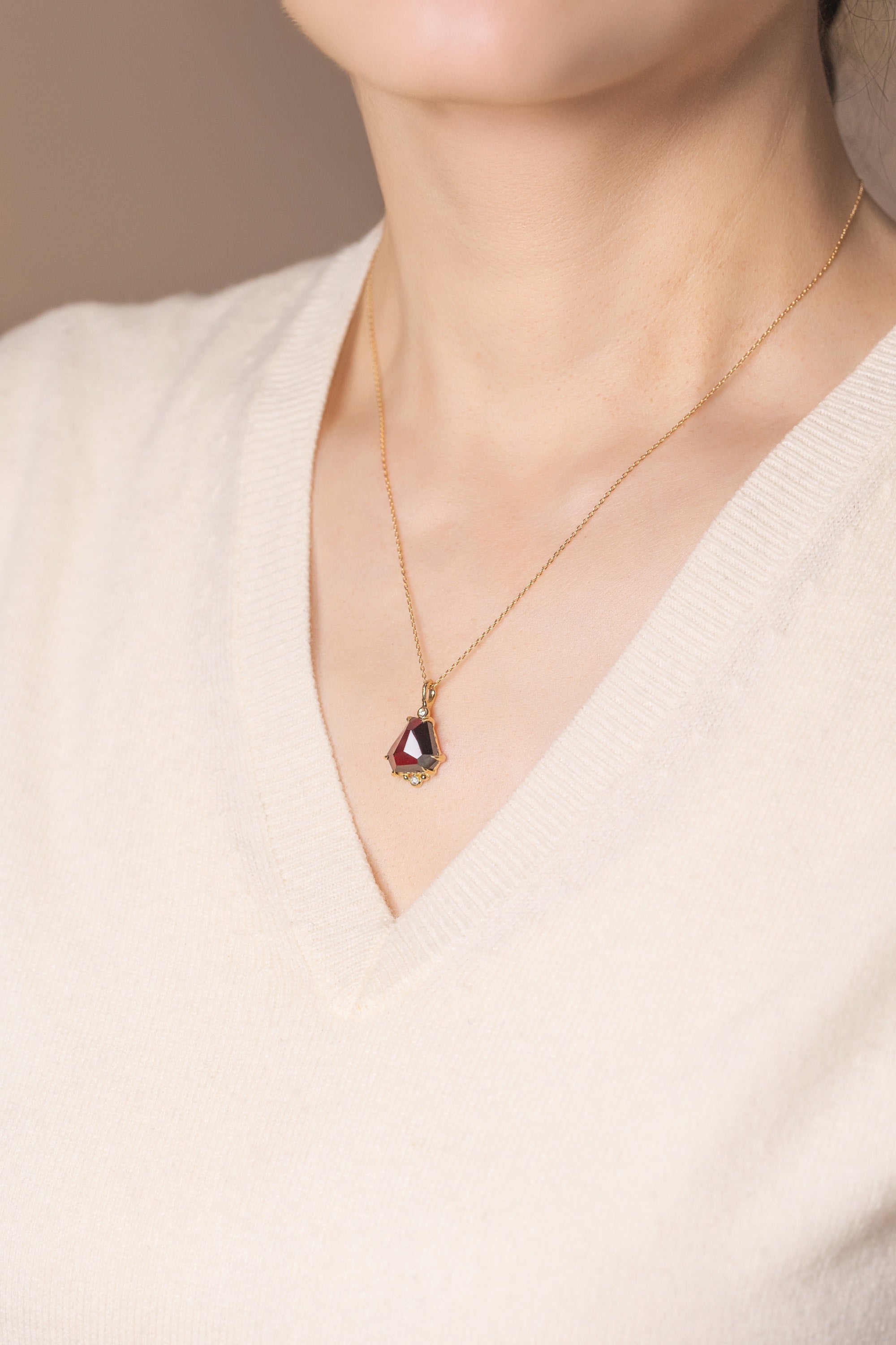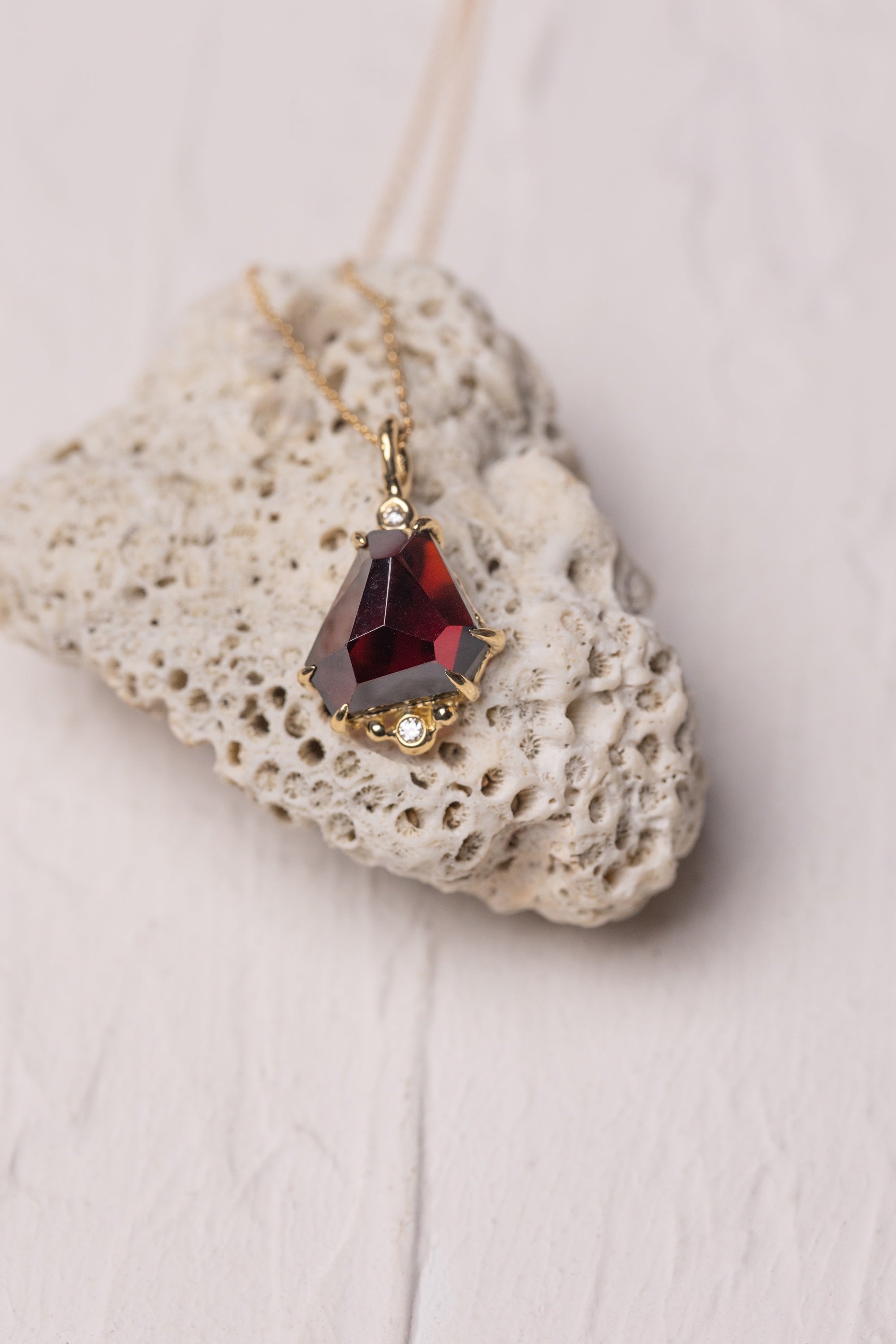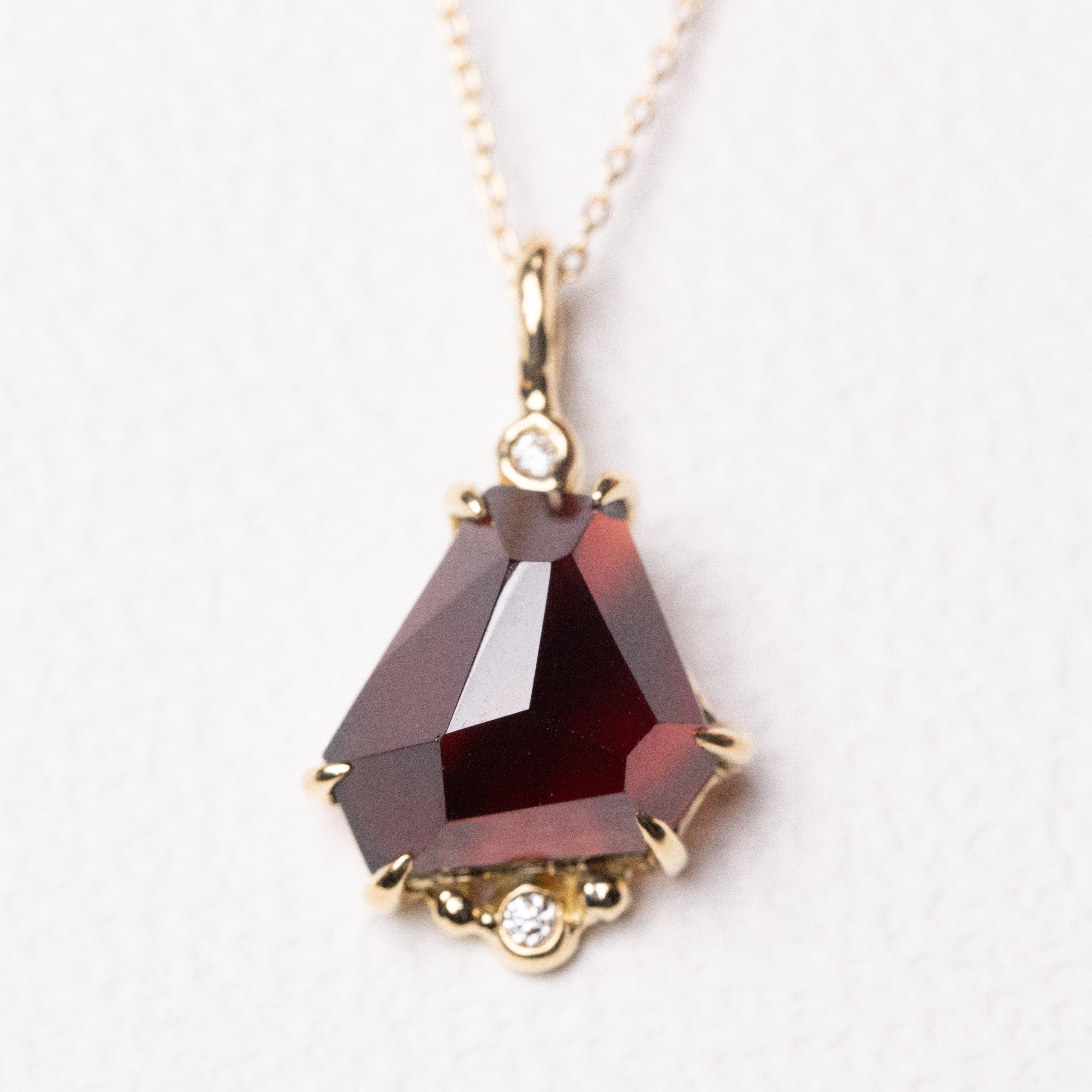 大きく面取りされたカットが印象的な赤い石に、上下で控えめに輝く小さなダイヤを添えたネックレスです。