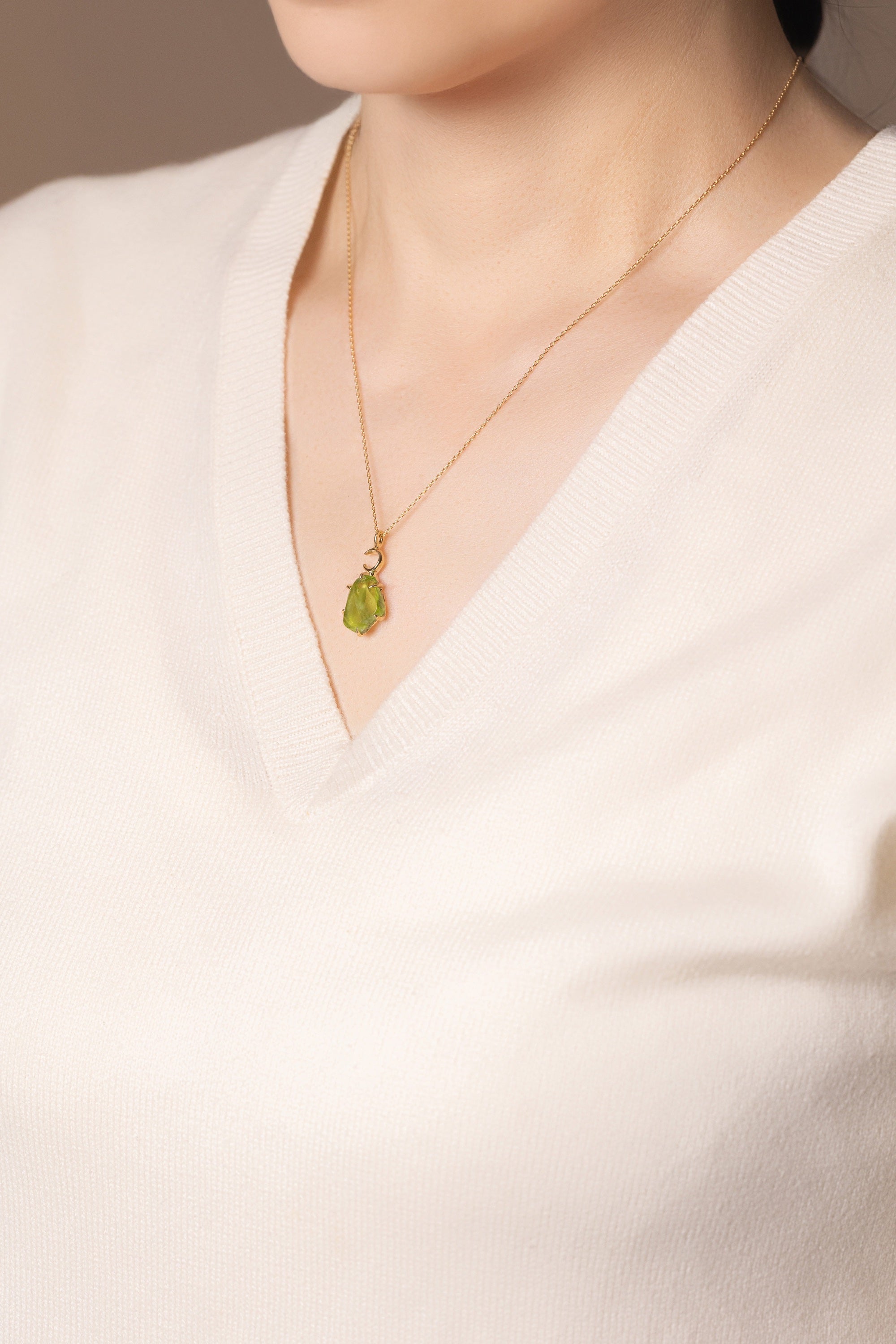 このネックレスも同じで、三日月があることで、緑の光が「ただ綺麗」から一歩だけ先に進む。