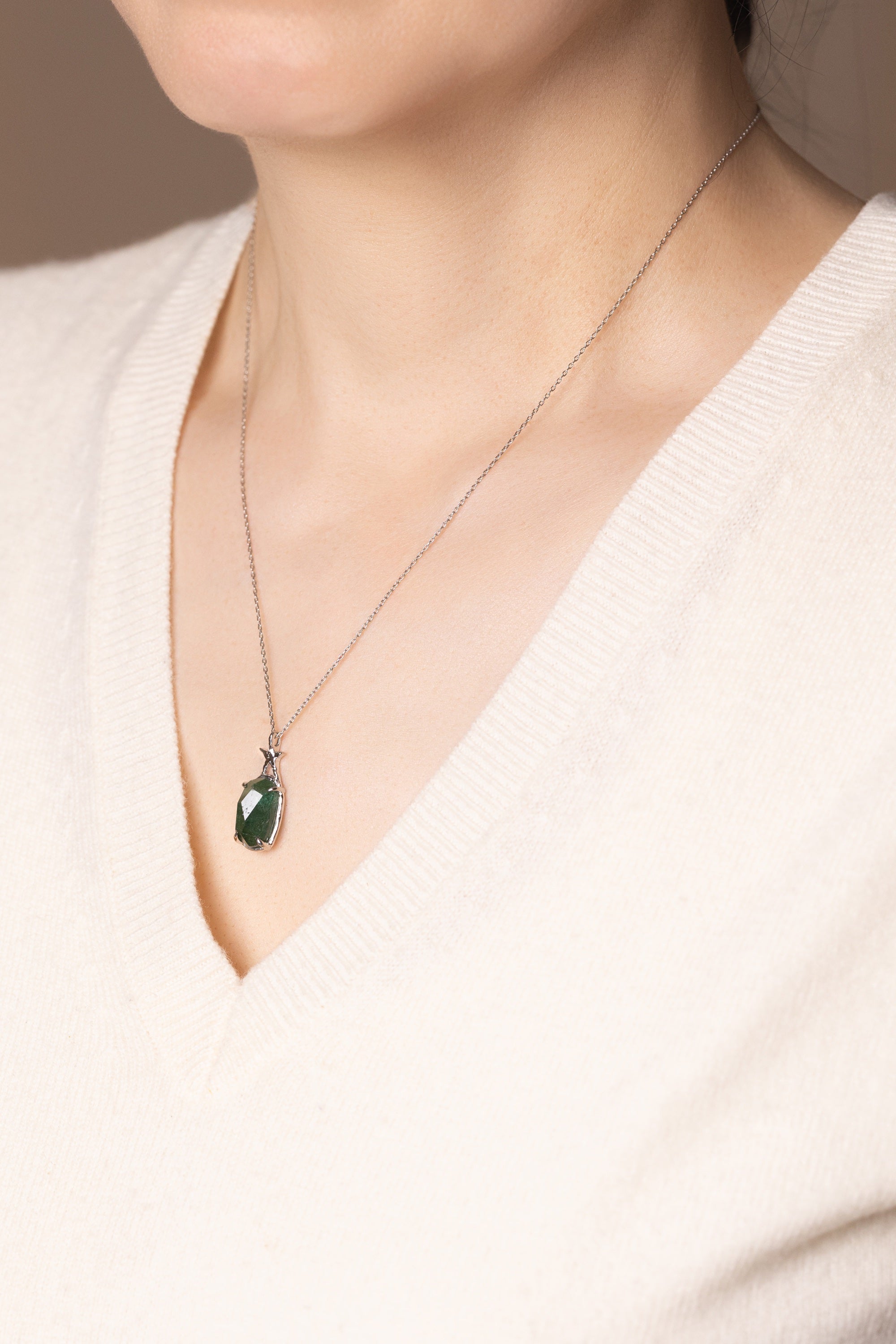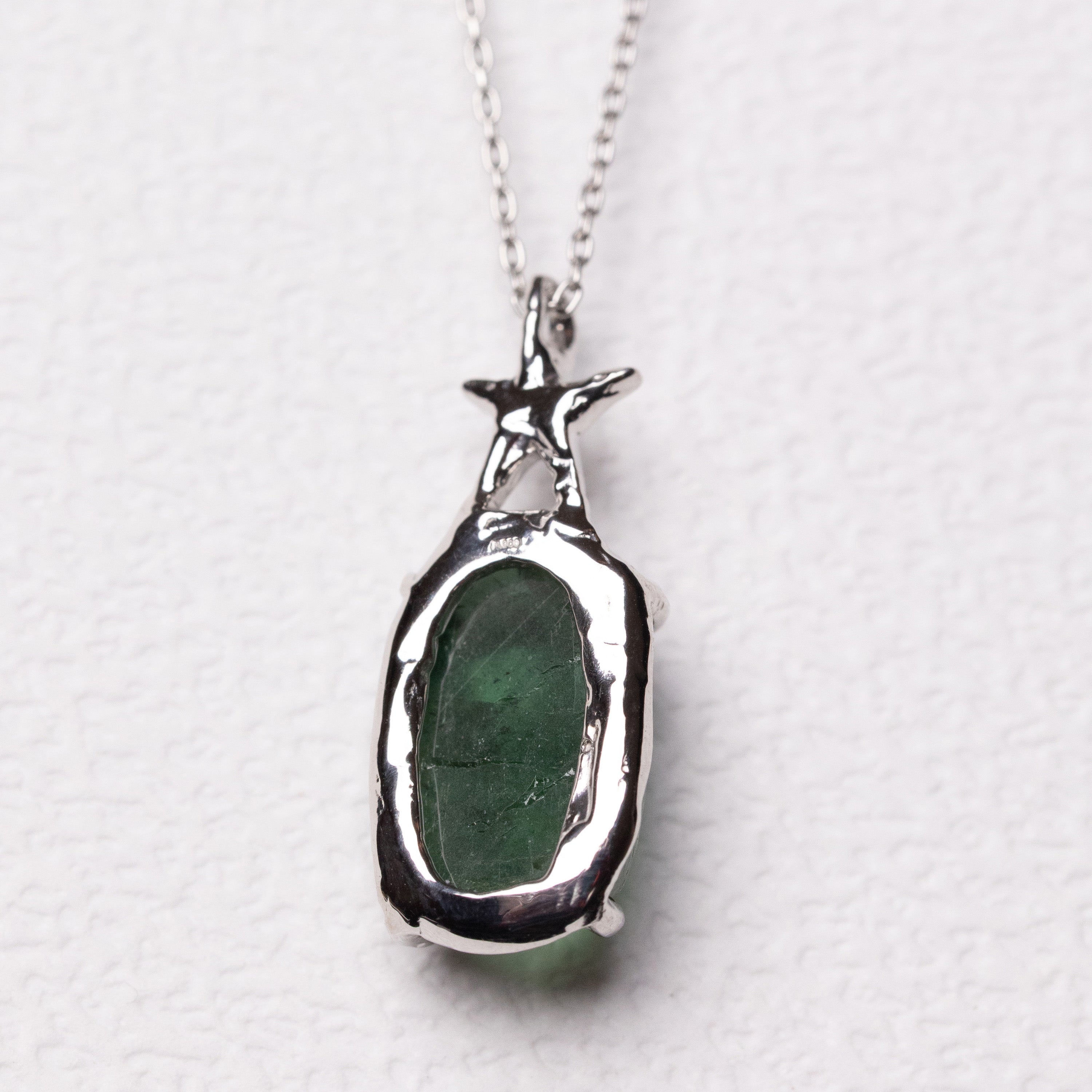 深みのある緑と、静かに輝く星を一体として楽しめるネックレスです。
