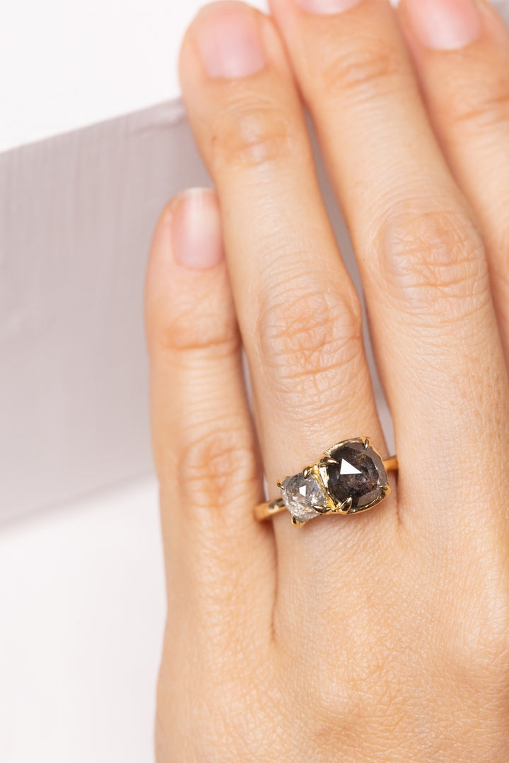 ブラックの大粒、その横に少し小さいグレーのダイヤモンドを並べた18金のリング。ブラックは透明な部分と「胡椒」のような色の部分がある「ソルト&ペッパー」と呼ばれているもの。丸に限りなく近い四角で、落ち着いた色とこの形がブラックをソフトな印象にしています。グレーのダイヤは透明なところと白っぽいところがあるもの。両方の色、輝きの違いが楽しめます。