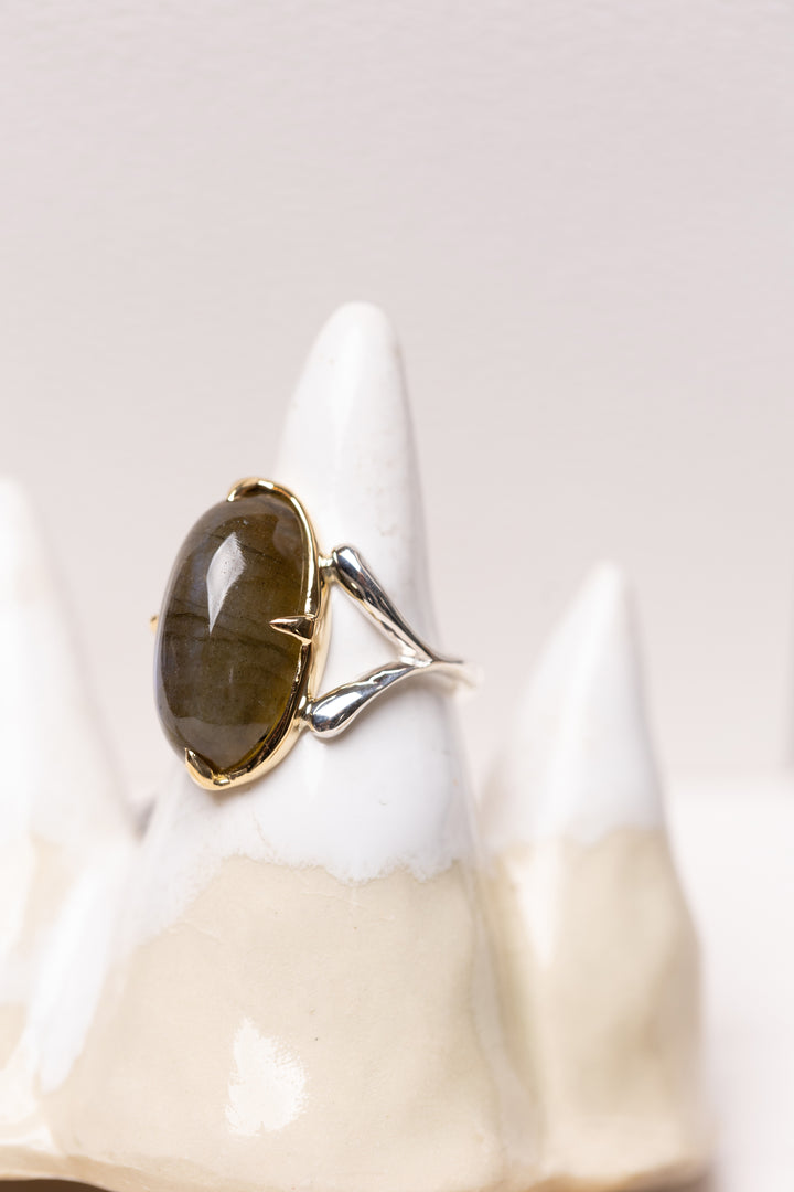 オーバル型、カボションのラブラドライトは、表面に遊色が浮かぶというより石の中に宇宙が広がるように見えます。ちゅるんっとした石の質感があり、石の真ん中、縦に青味が走り、イエローやグリーンはその周辺にふんわりと煙のように揺れて見える少し珍しい石。デザイナーのMayaが「魔法使いの…」と呼ぶのが、なんとなくわかる気がします。