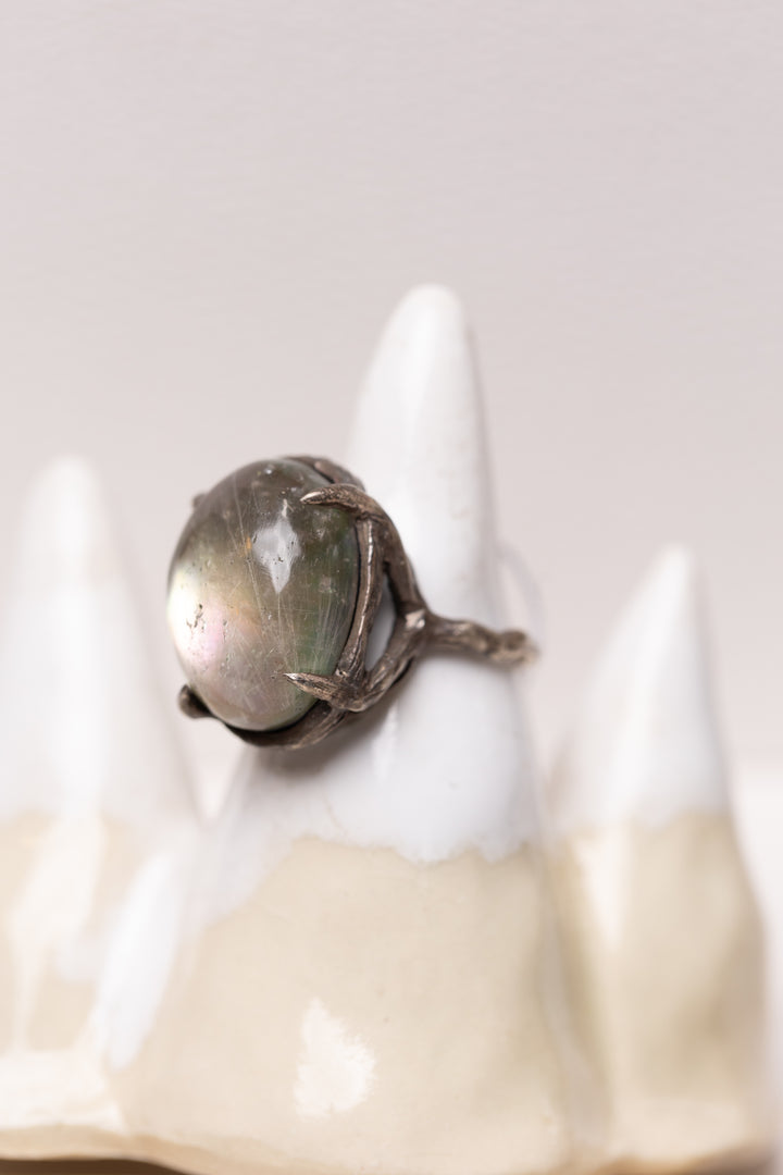 黒蝶貝にルチルクオーツを貼り合わせ、小枝のリングに留めました。 ルチルクオーツは金針以外にも内包物があり、水の中をのぞいた時のような、心躍り、天然石ならではの「1点モノ感」が。黒蝶貝と貼り合わせることで、貝の表面に現れる虹色の輝きが石の中から解き放たれるようです。シルバーの燻し加工が、石、貝の色によく合った、シックなトーンにまとまったリングです。