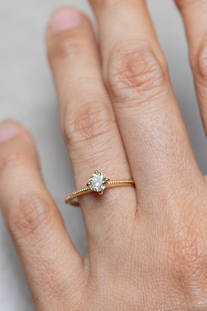 鋭く明るい光を放つブリリアントカットの美しさとは違う、「アンティークダイヤモンド」の優しい輝きかた。Mayaが「花火みたい」と言う形、光りかたをする丸くてかわいらしい印象のダイヤを、ナイフエッジにミル打ちを施した「アンナ」の細いアームに留めたリングです。ダイヤの色は「ライトブラウン」。18金のイエローゴールドになじみます。アームが細いので、重ね付けするなら曲線のあるものと組み合わせるとダイヤがくっきり浮かび上がります。