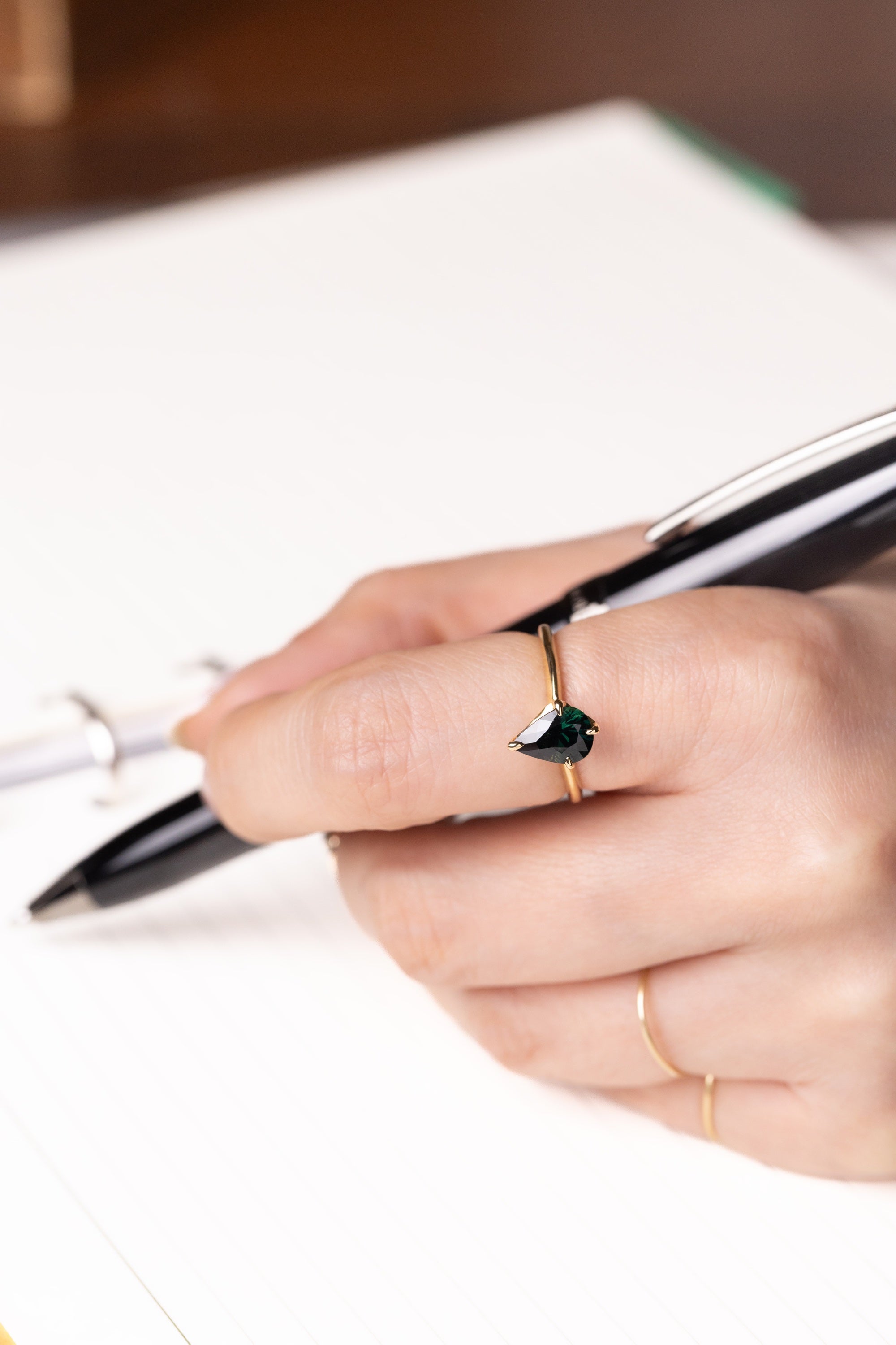 深いティール色が印象的なペアシェイプのオーストラリア産サファイアをセットしたリング。石座の裏には星型に留められたダイヤが、着ける人にだけわかる特別な輝きを添えています。高さを出し、濃い色のサファイアに光を集めるようデザインされた台座とナイフエッジに仕上げたシンプルなデザインの腕が、サファイアの色合いと形を際立たせ、繊細で上品な印象を作っています。ペアシェイプのカーブに「V字に並ぶダイヤのリング」をはめ込むようにして重ね付けするのもileava jewelryらしいコーディネートです。