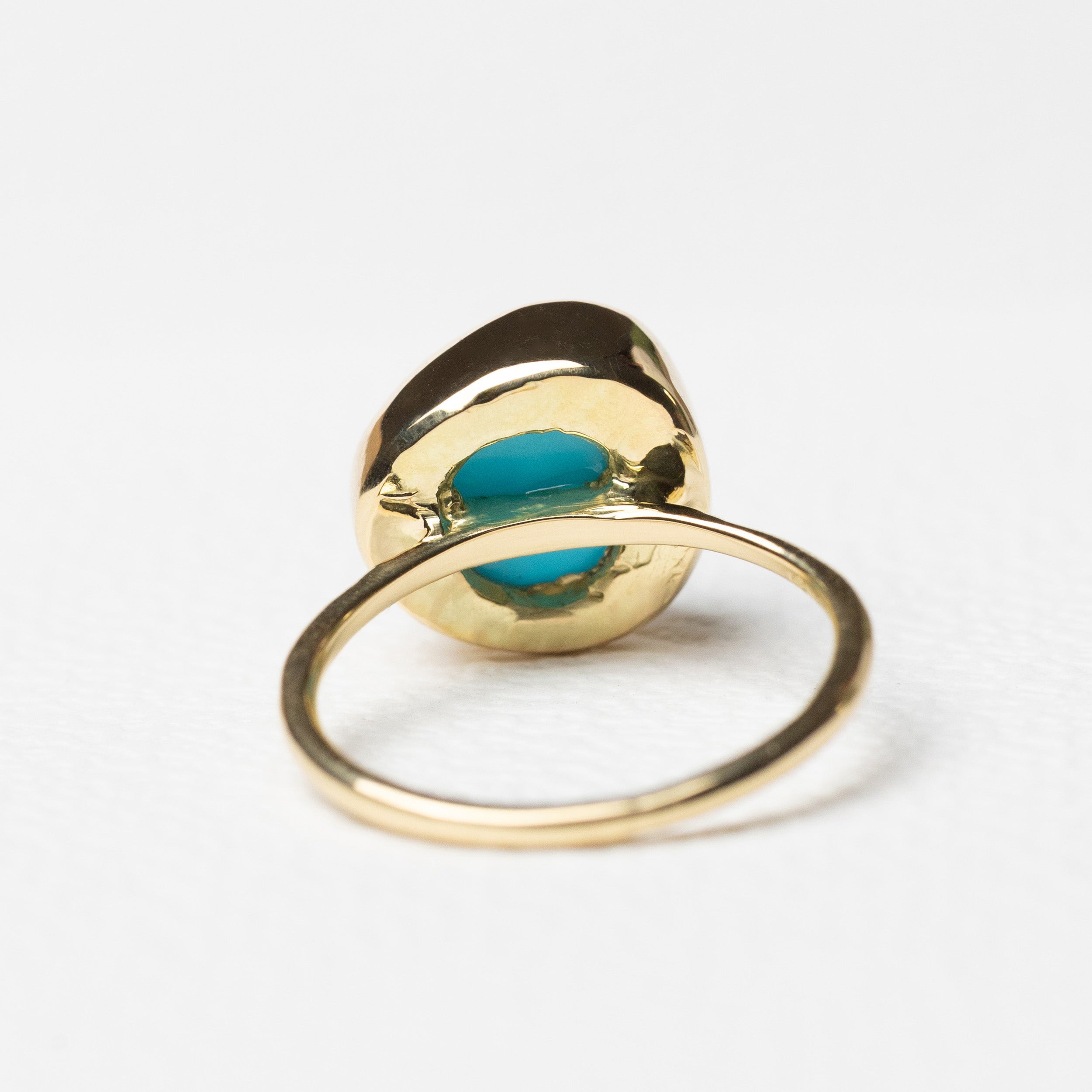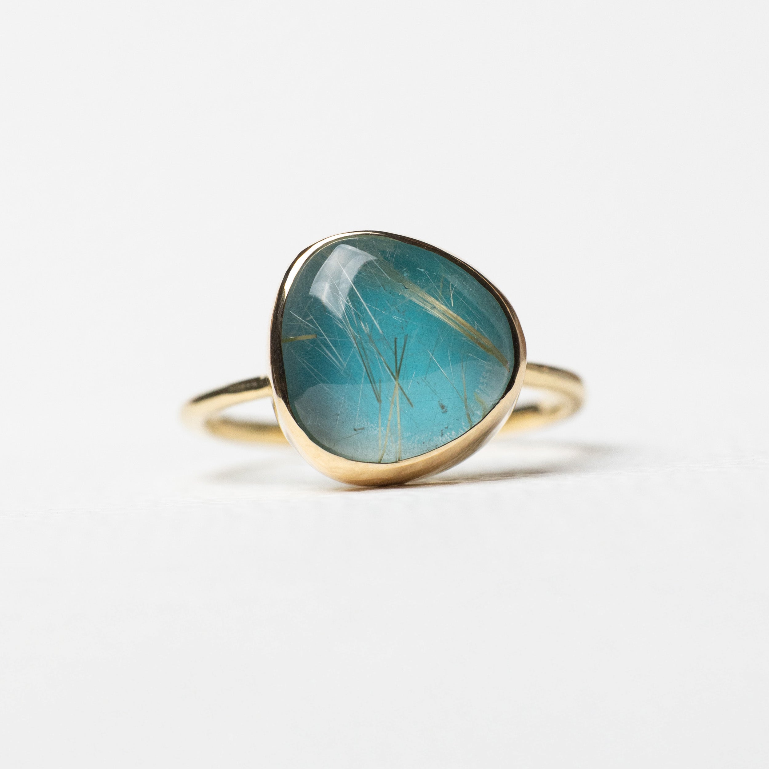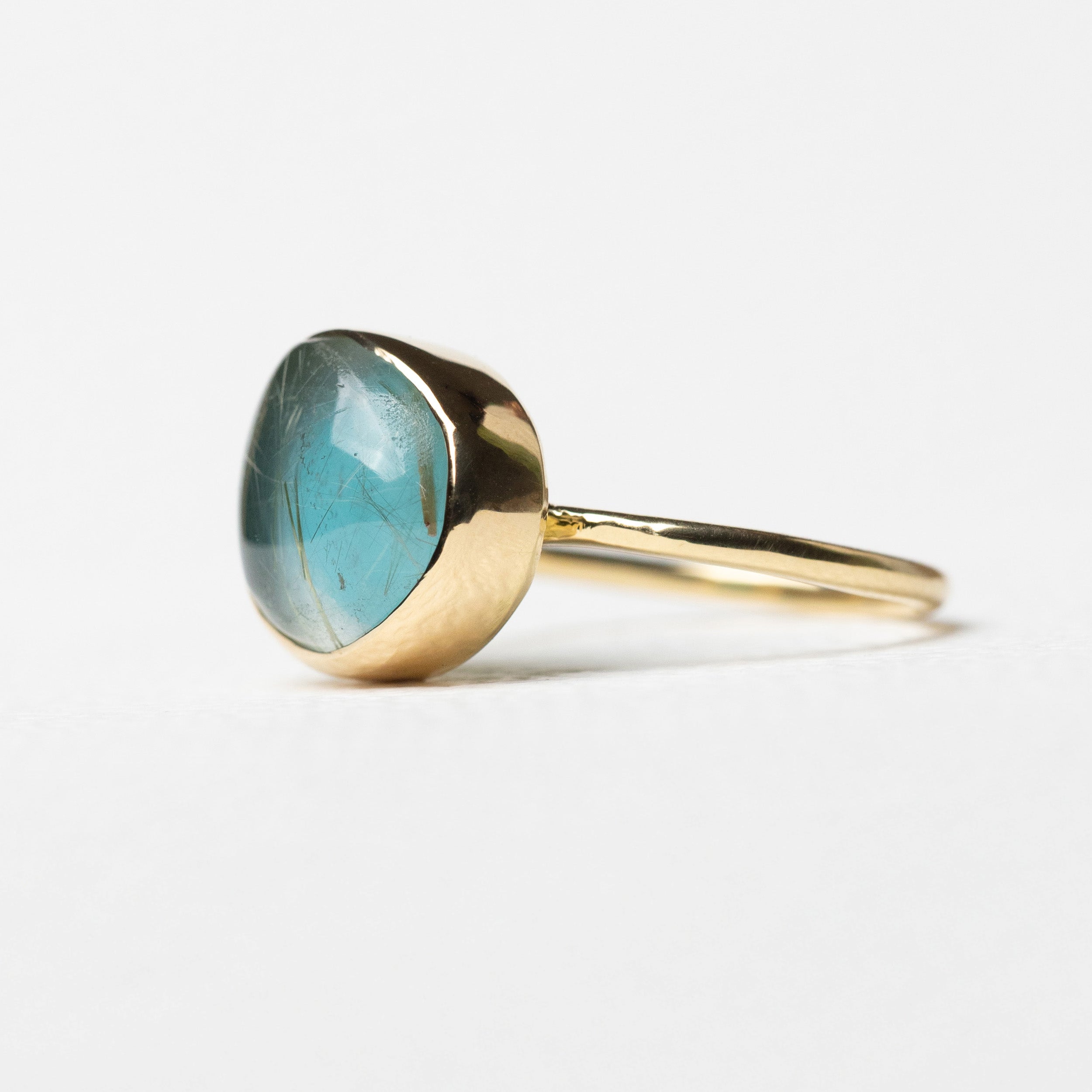 ターコイスとルチルクォーツを貼り合わせた、なめらかな表情の石を、爪のないふくりんで包み込んだリングです。