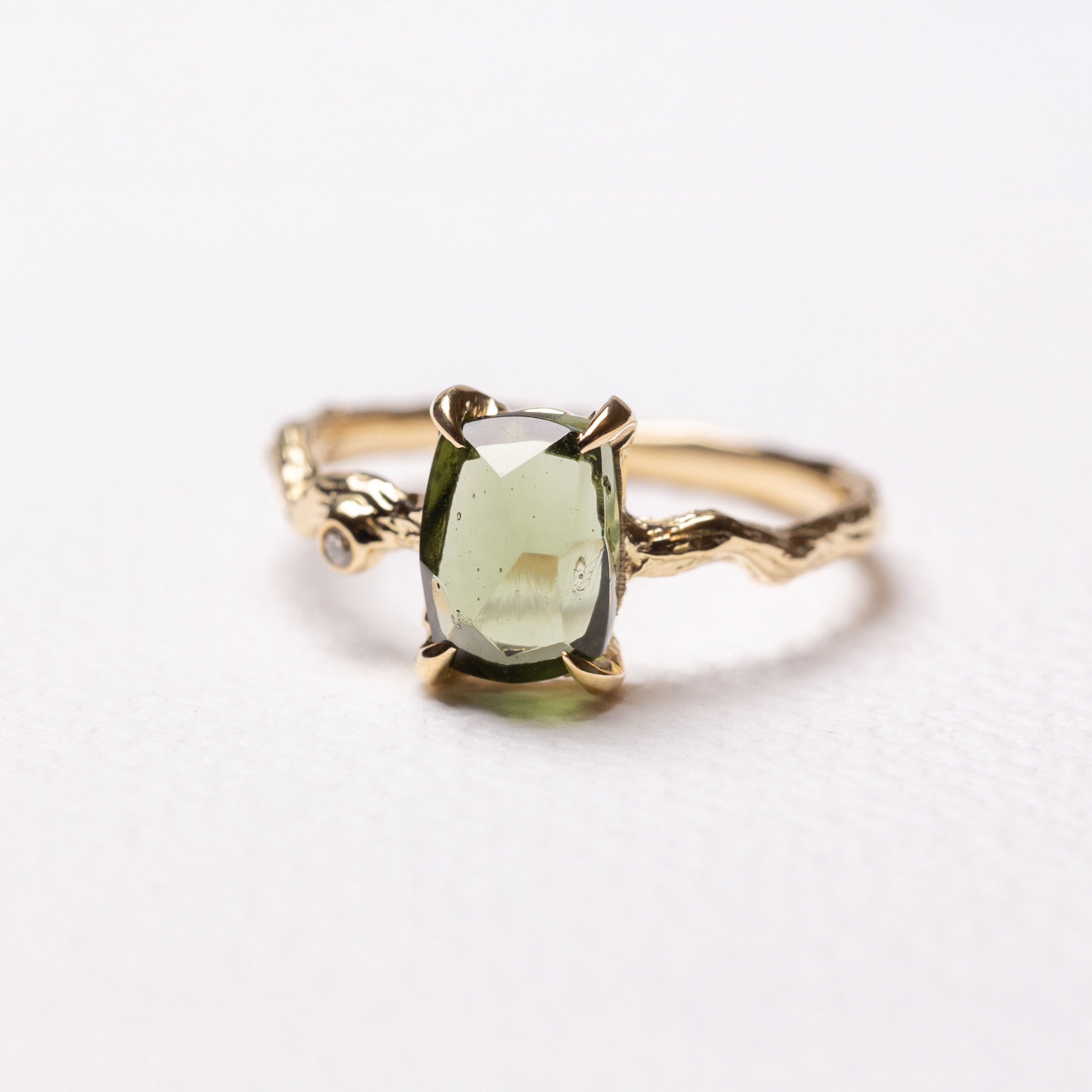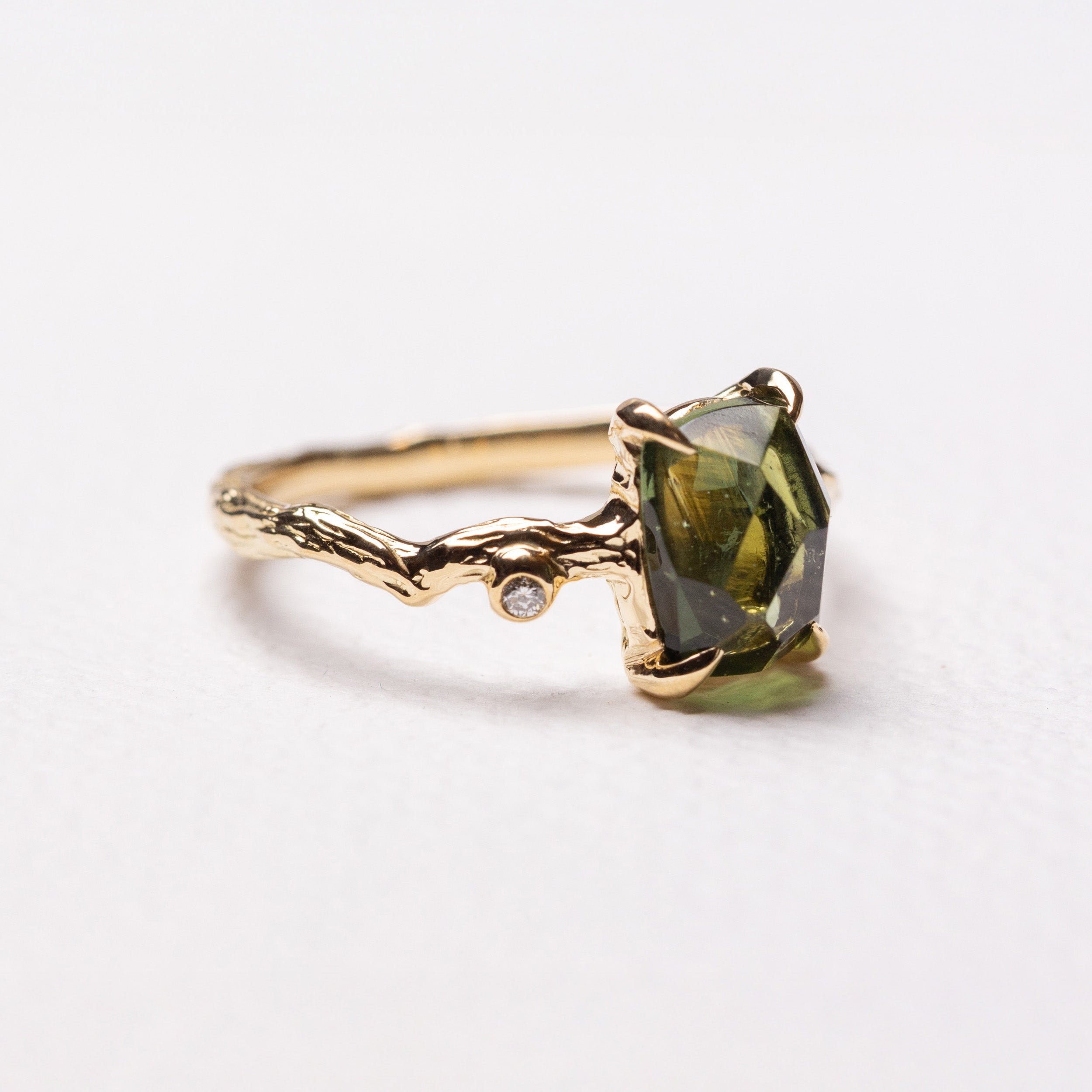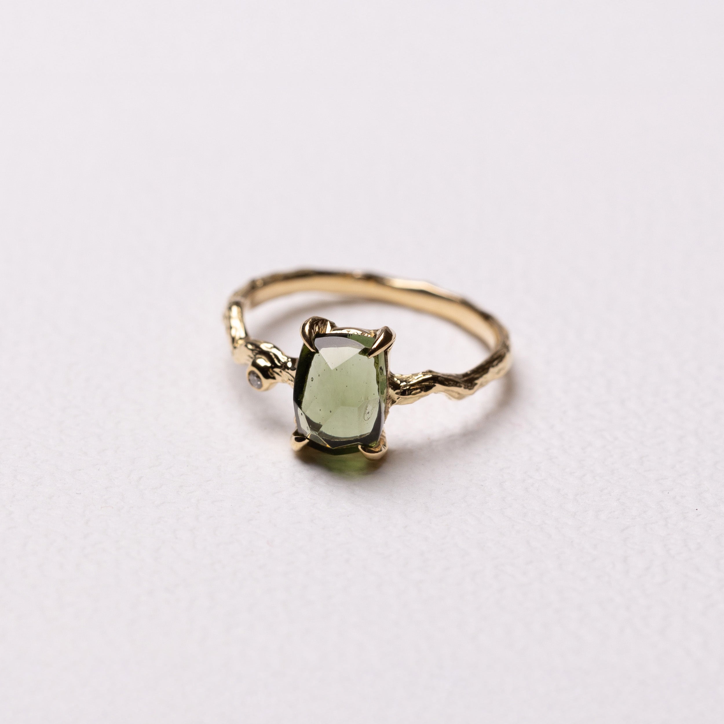 大きな面でカットされたモルバダイトを、枝のテクスチャーが残るK18のリングにダイヤモンドと共に留めました。