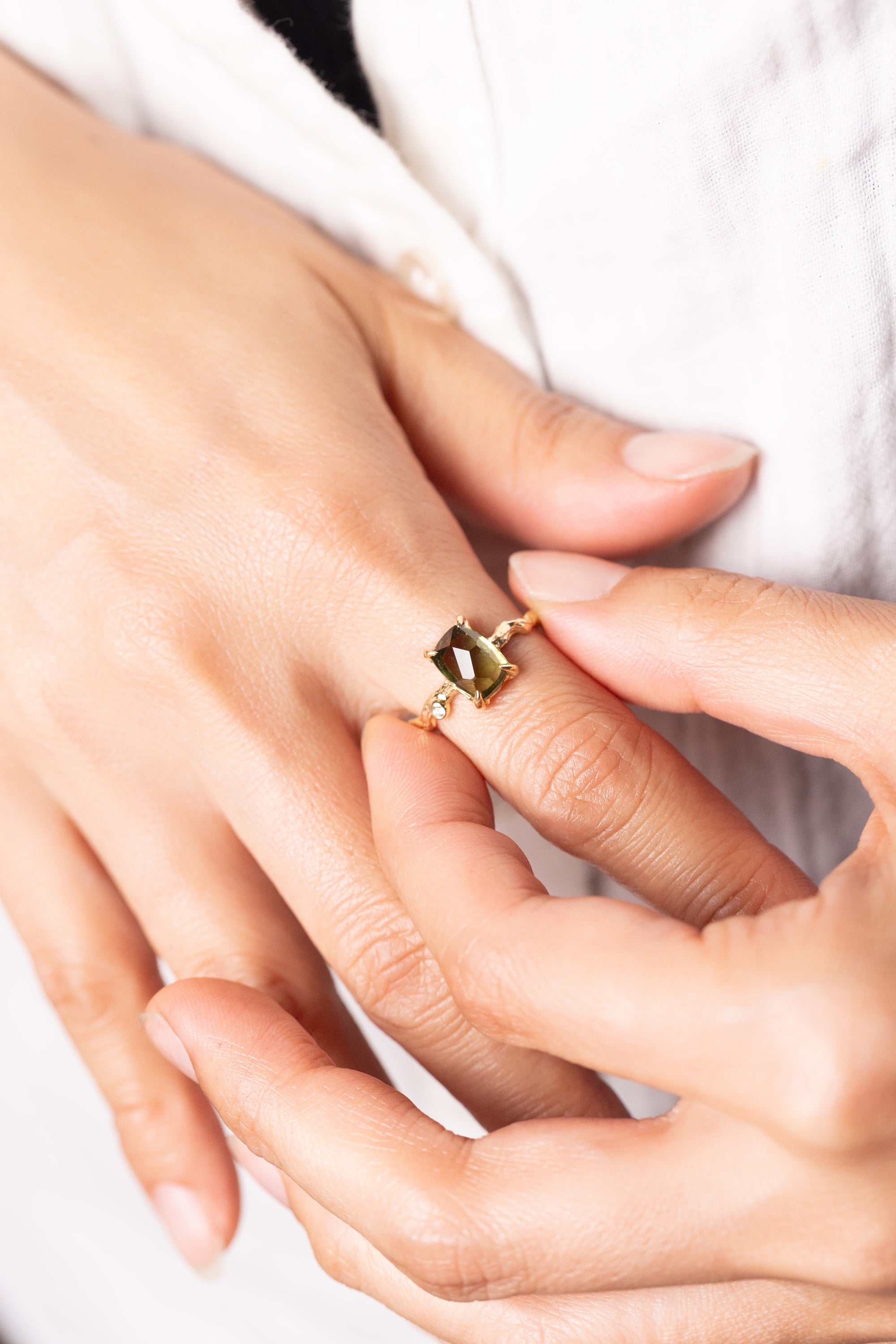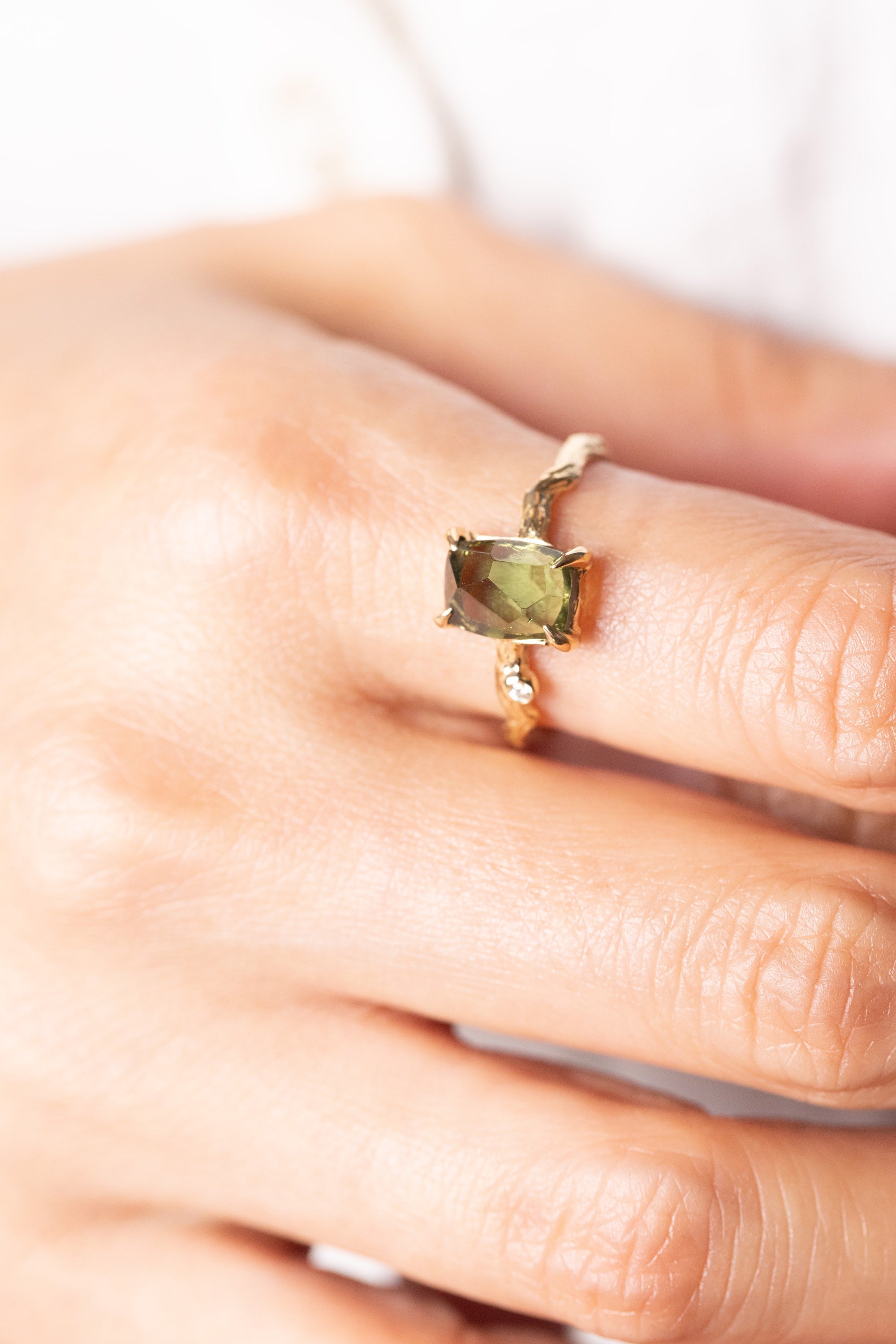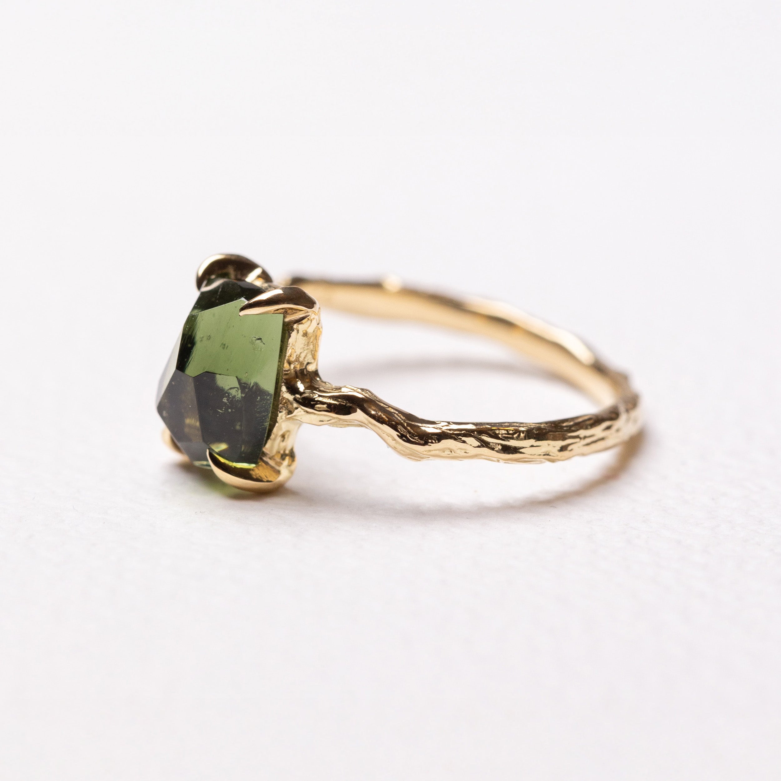 大きな面でカットされたモルバダイトを、枝のテクスチャーが残るK18のリングにダイヤモンドと共に留めました。