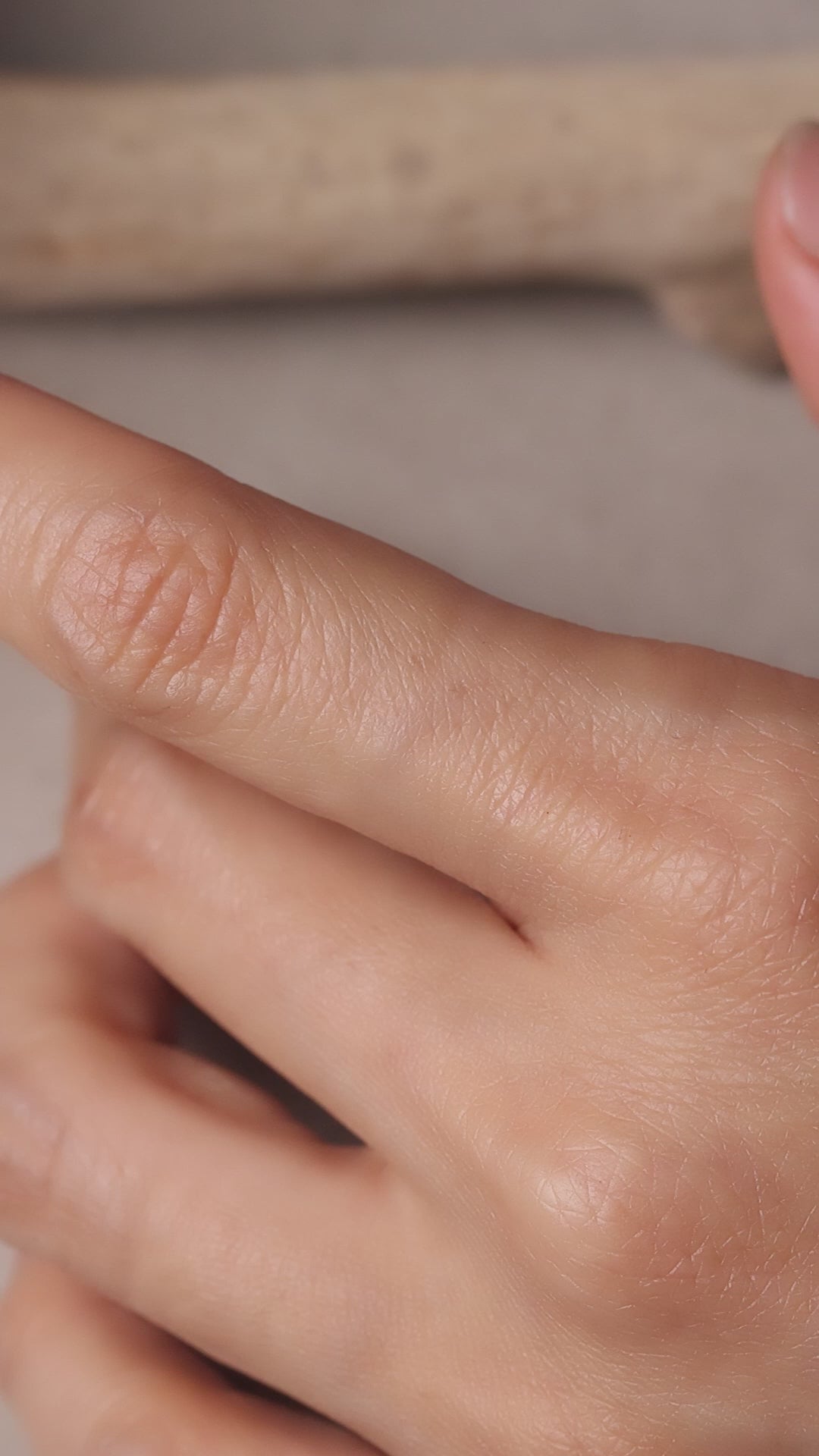 その石を受けとめるリングには、枝の質感をそのまま写し取ったようなテクスチャーを。自然の中から拾ってきたような佇まいで、モルバダイトの存在感としっくりなじみます。