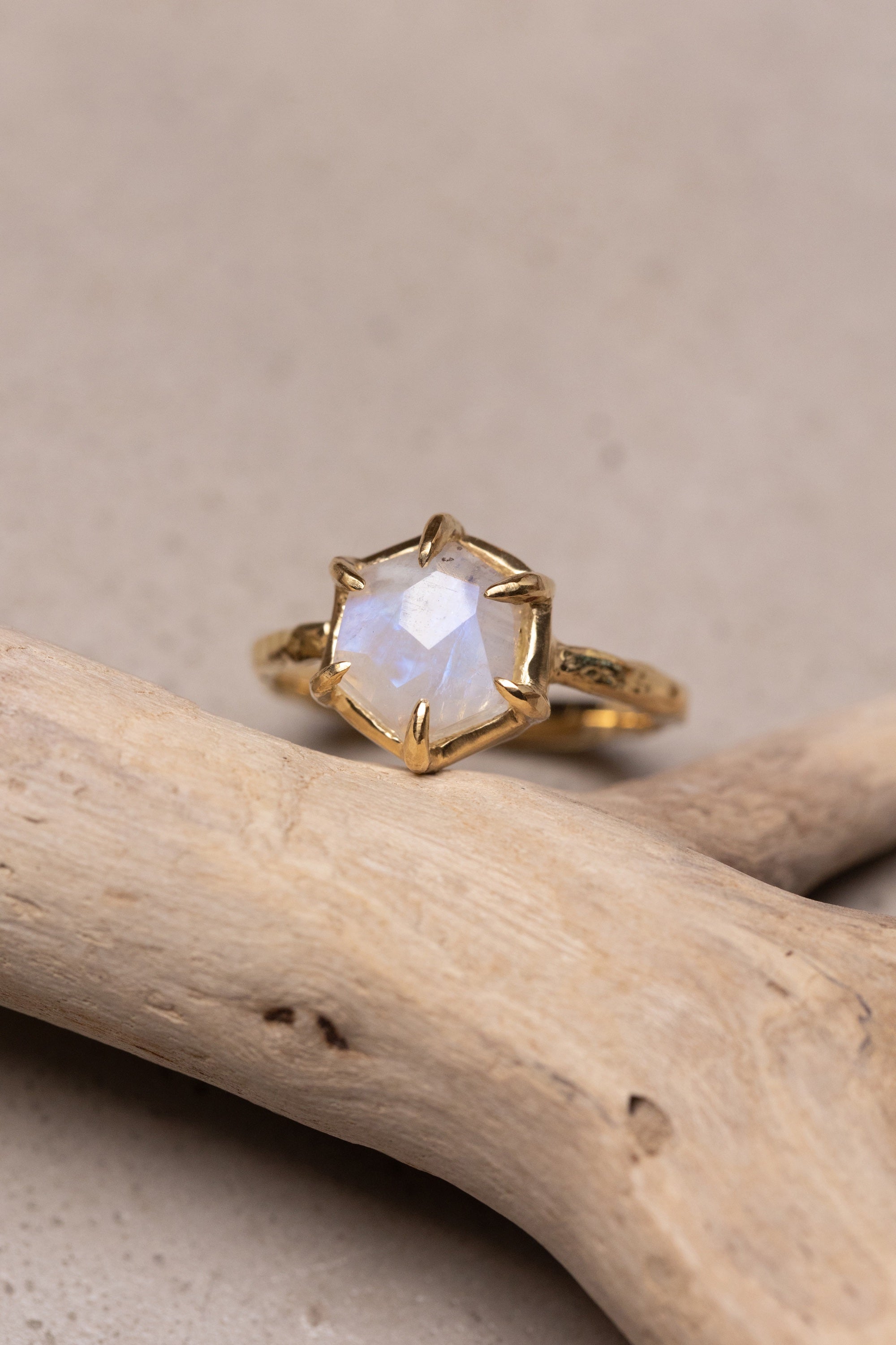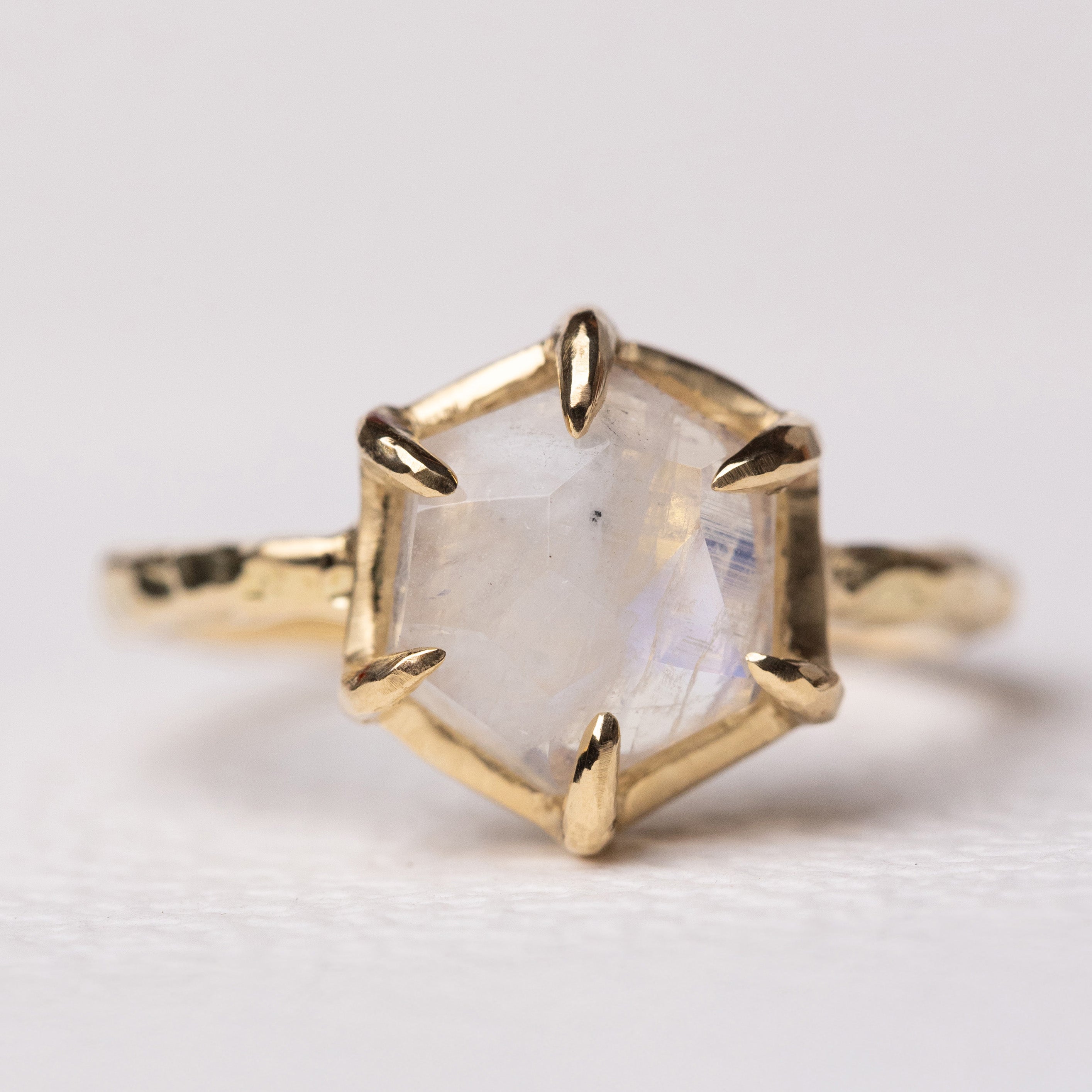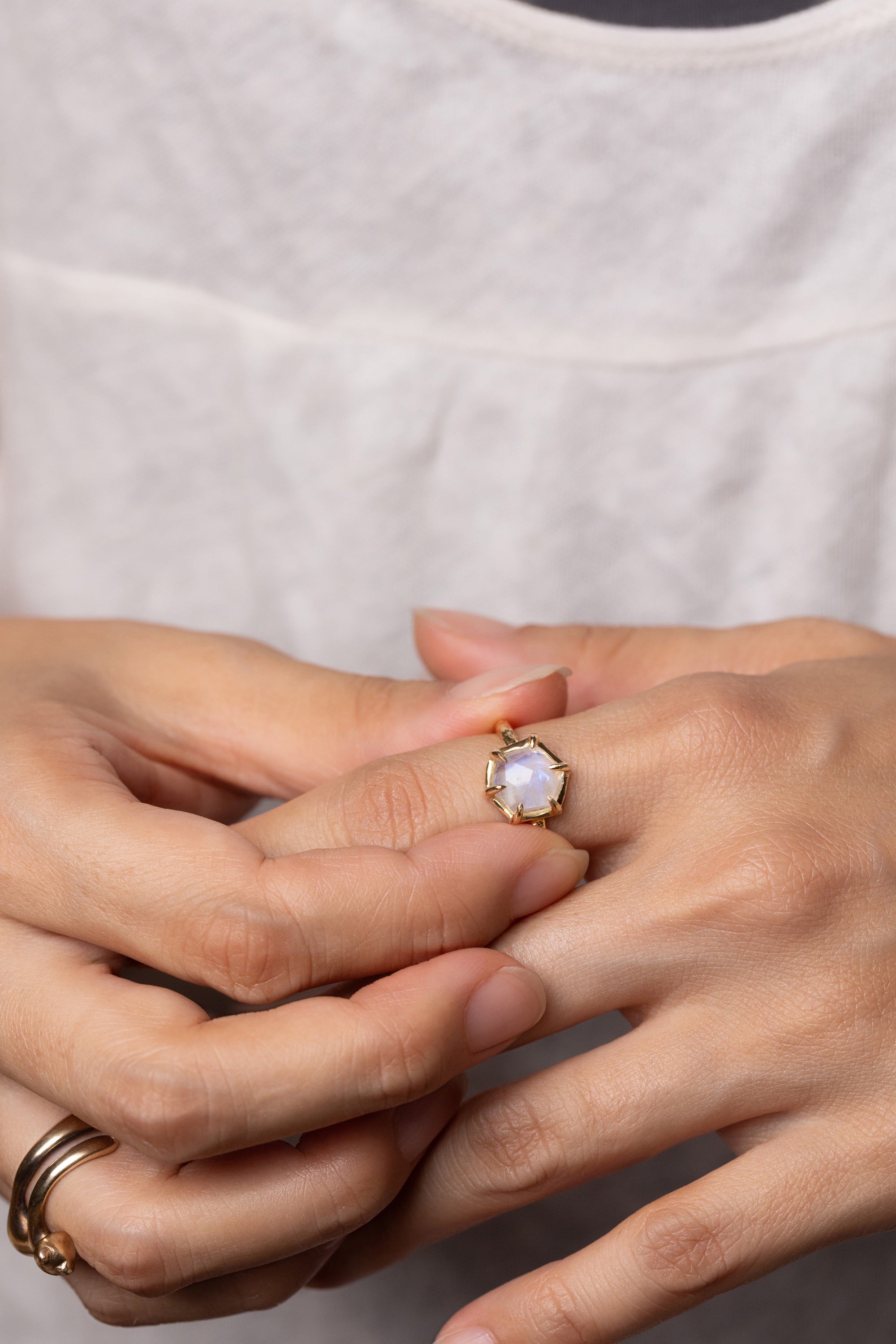 ブルームーンストーンの澄んだ光を、端正な六角形のフォルムに閉じ込めたリングです。