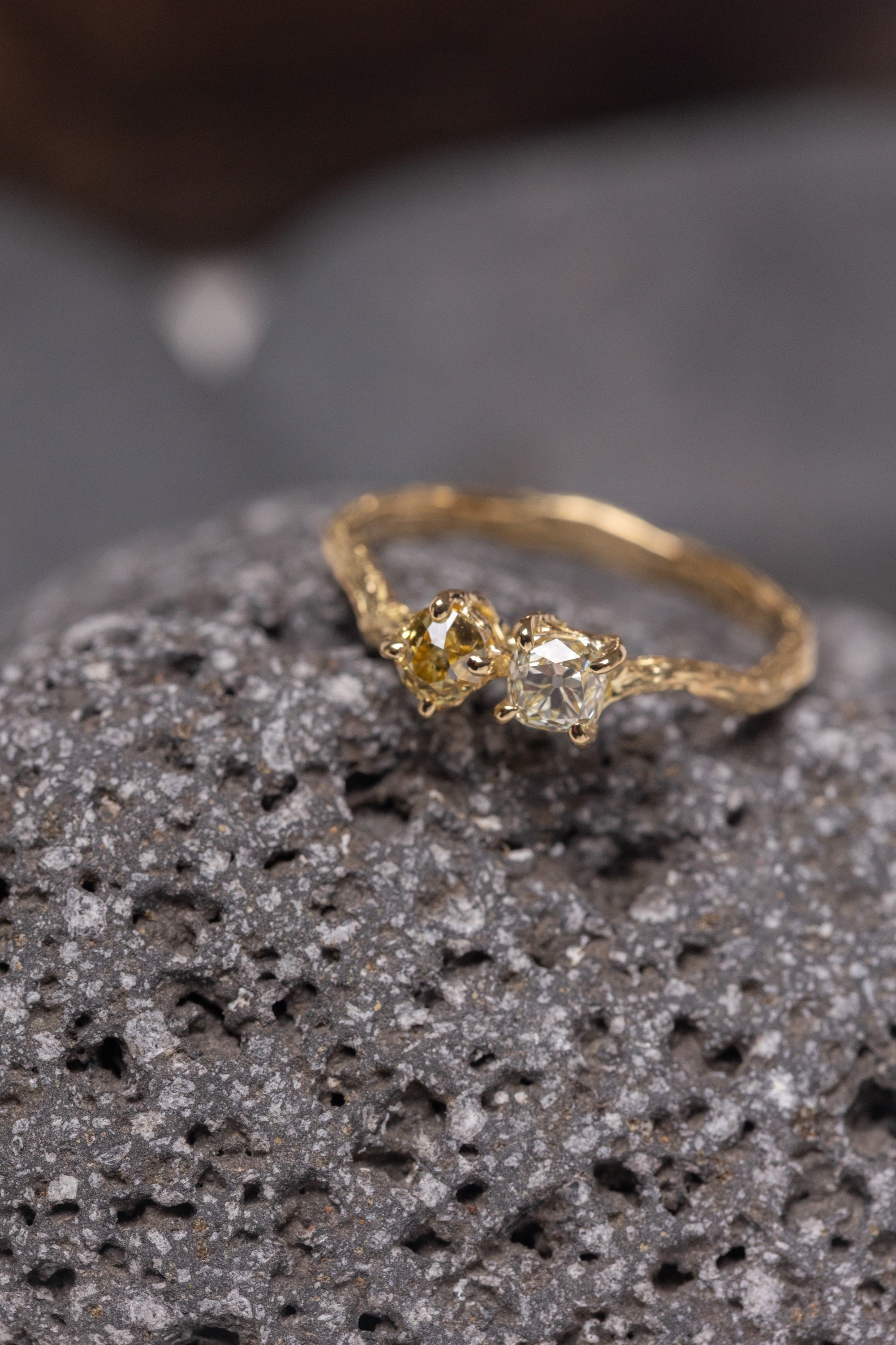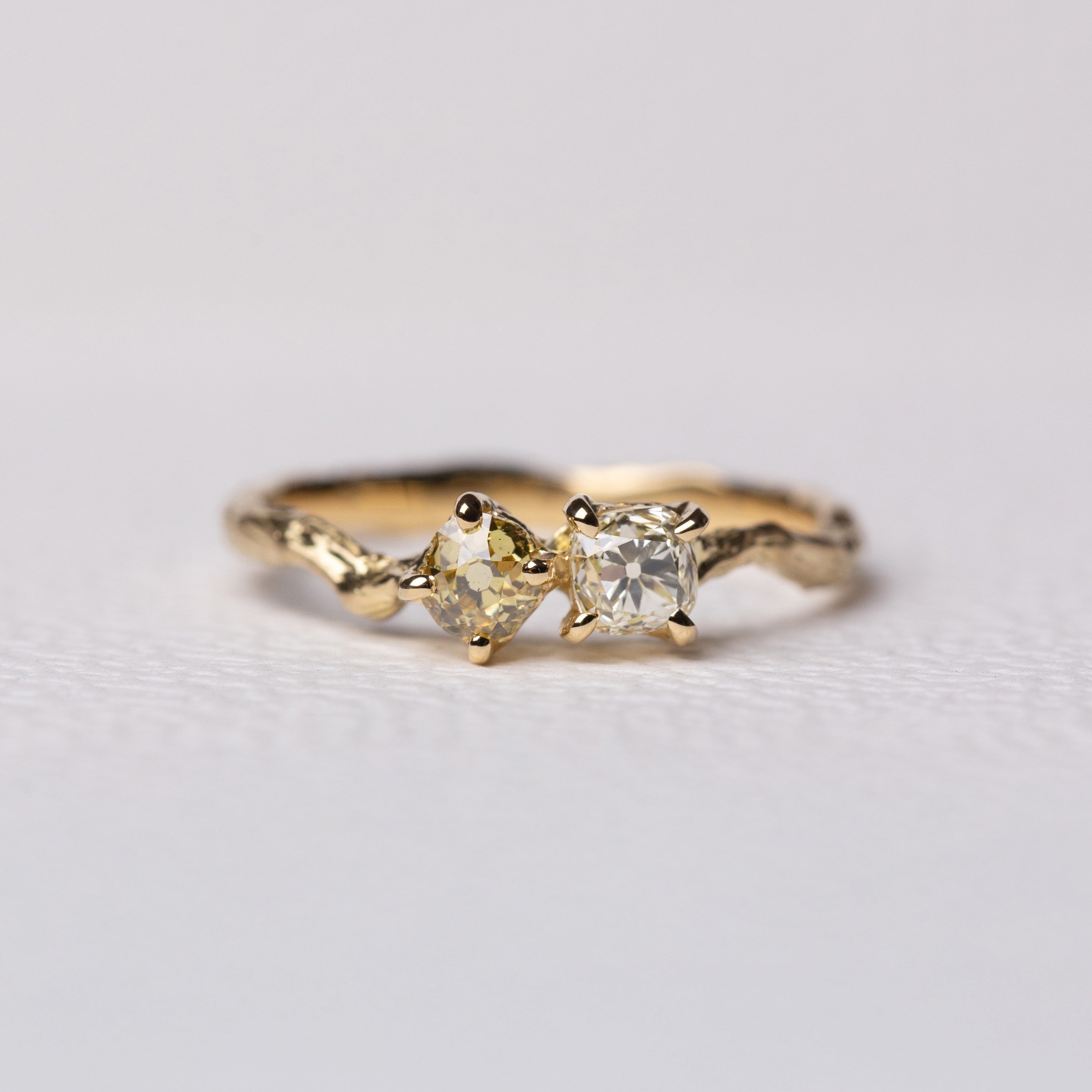アンティークカットのダイヤモンドとグリーンダイヤモンドが寄り添う、静かな輝きの Toi et Moi リングです。