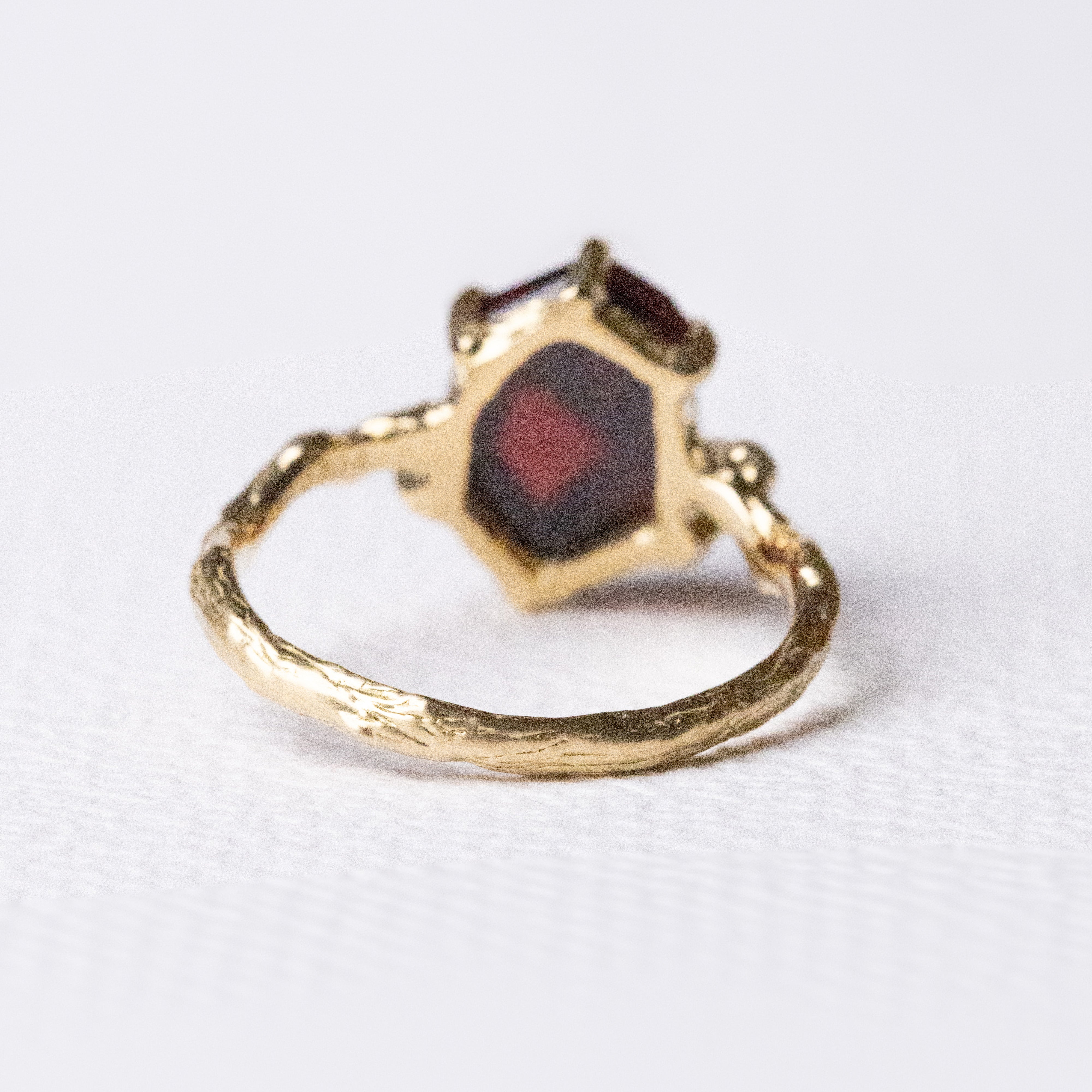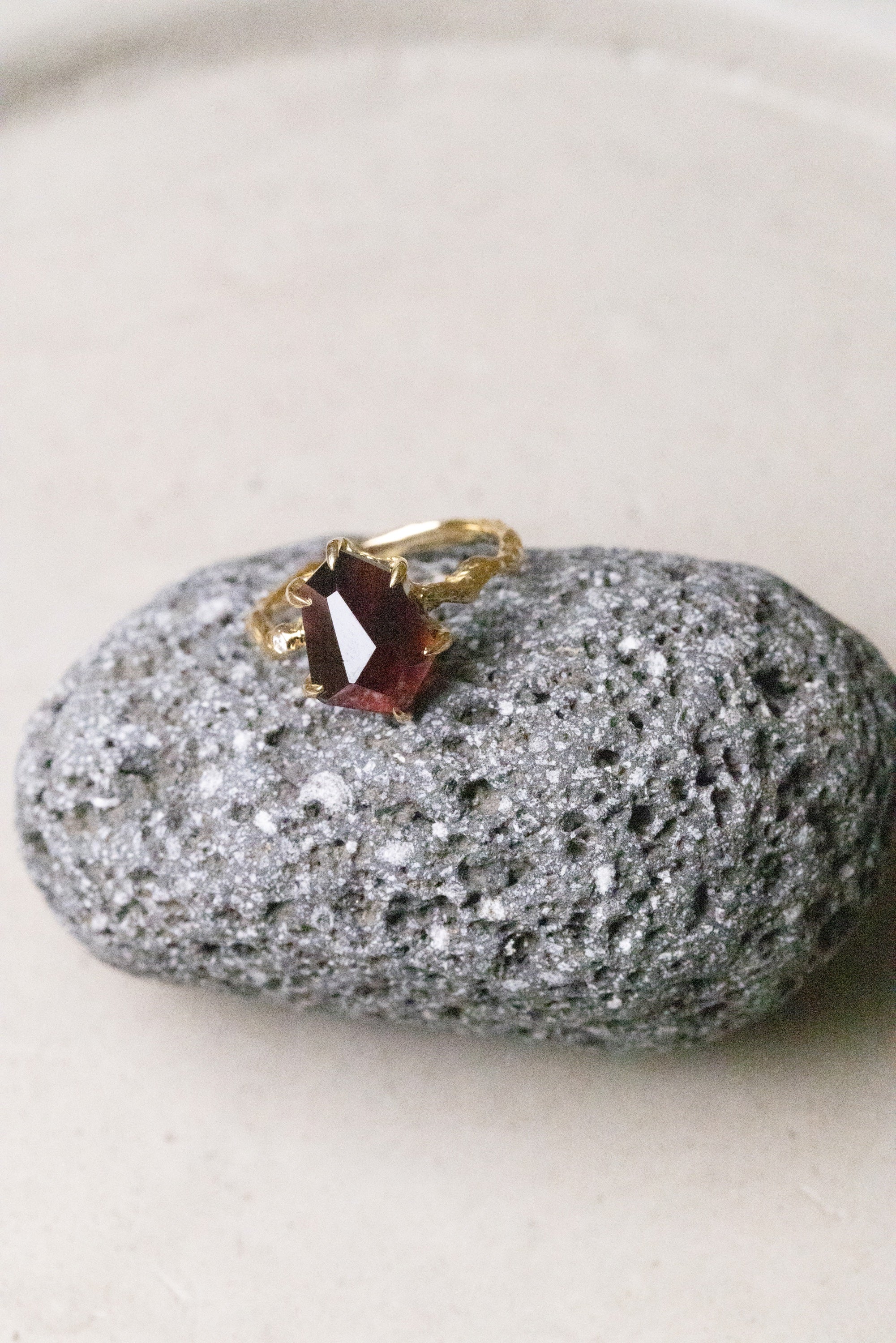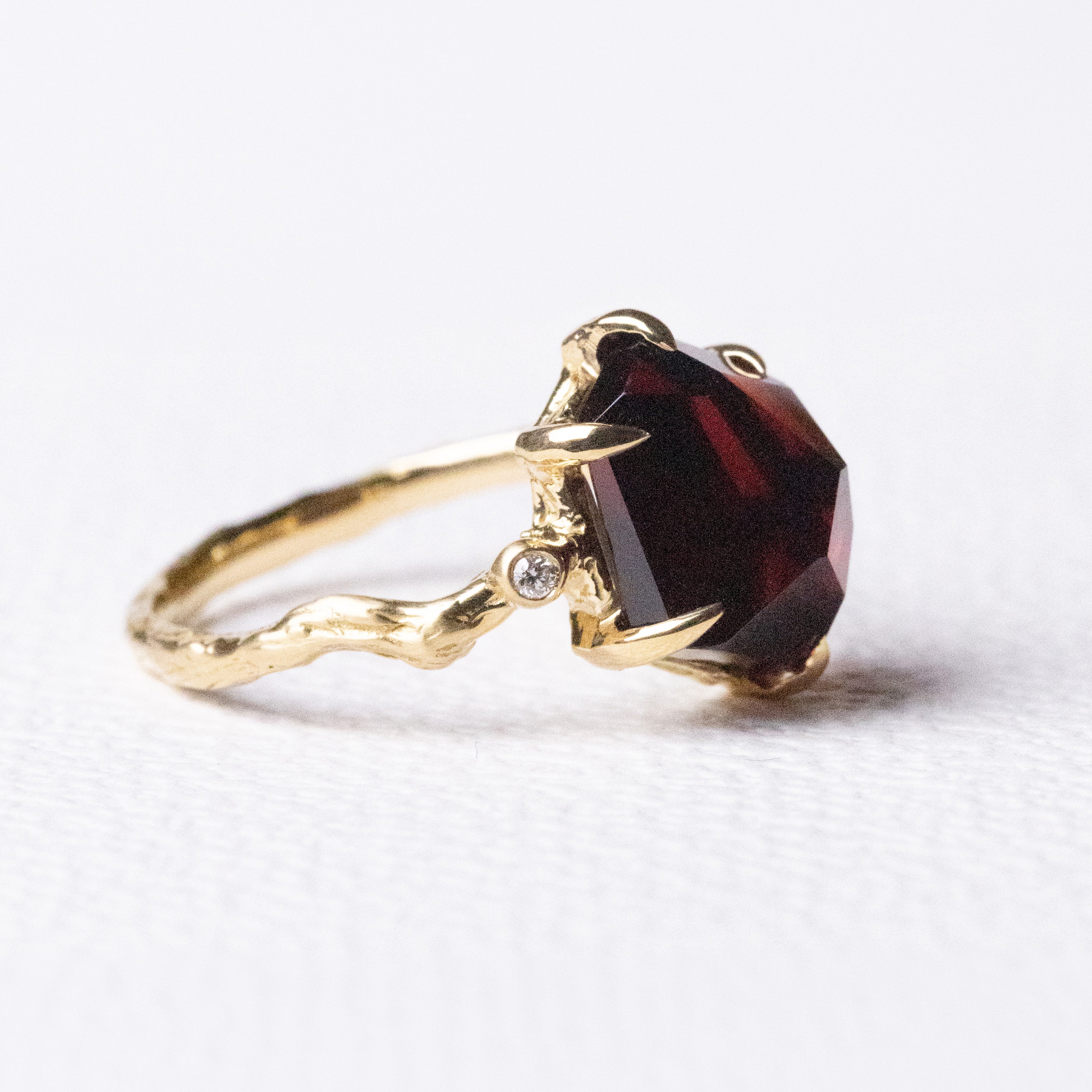 自然のかたちの中に、きちんと磨かれた面の輝き。有機的なフォルムと、シャープなファセット。その対比が、この指輪の静かな個性になっています。