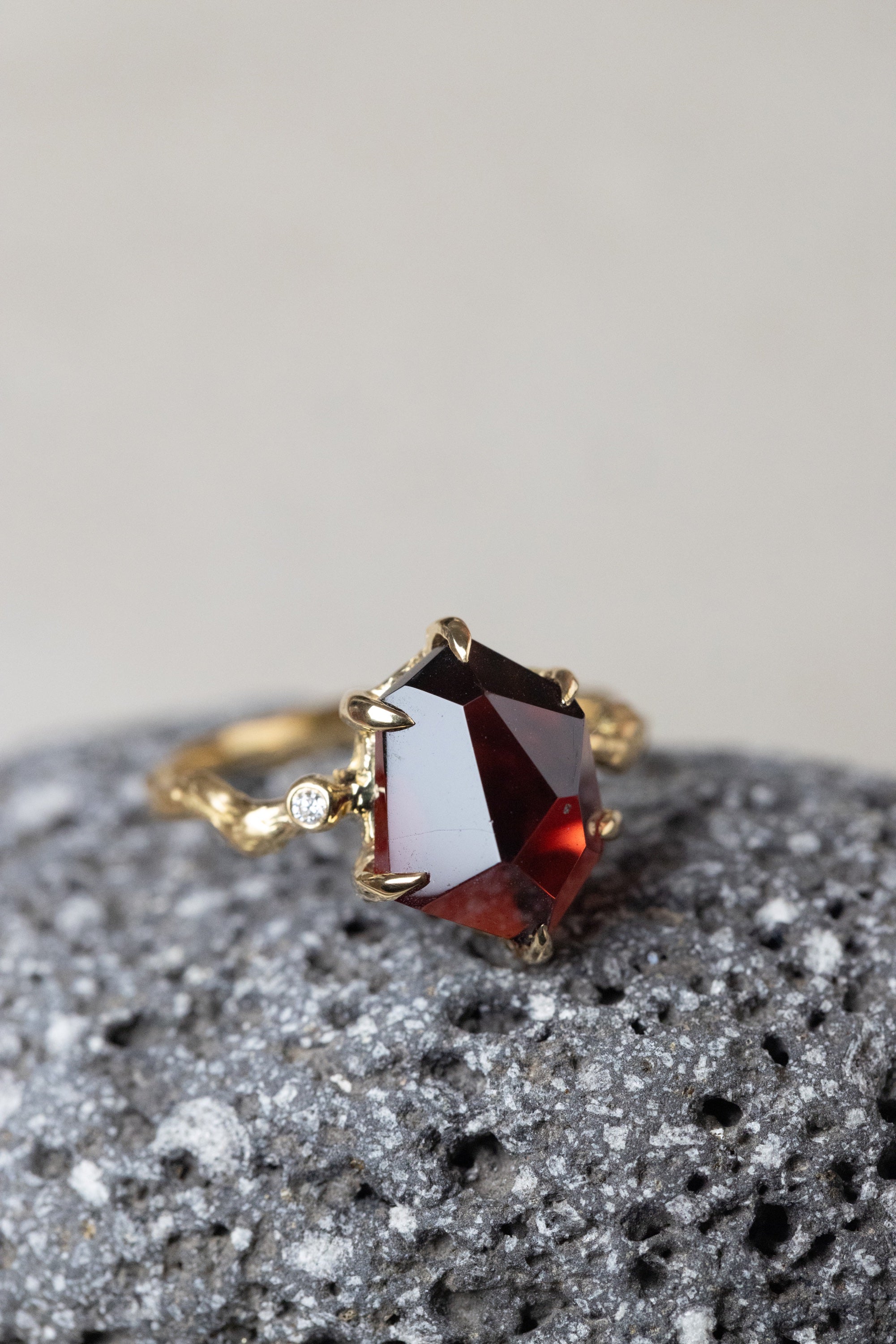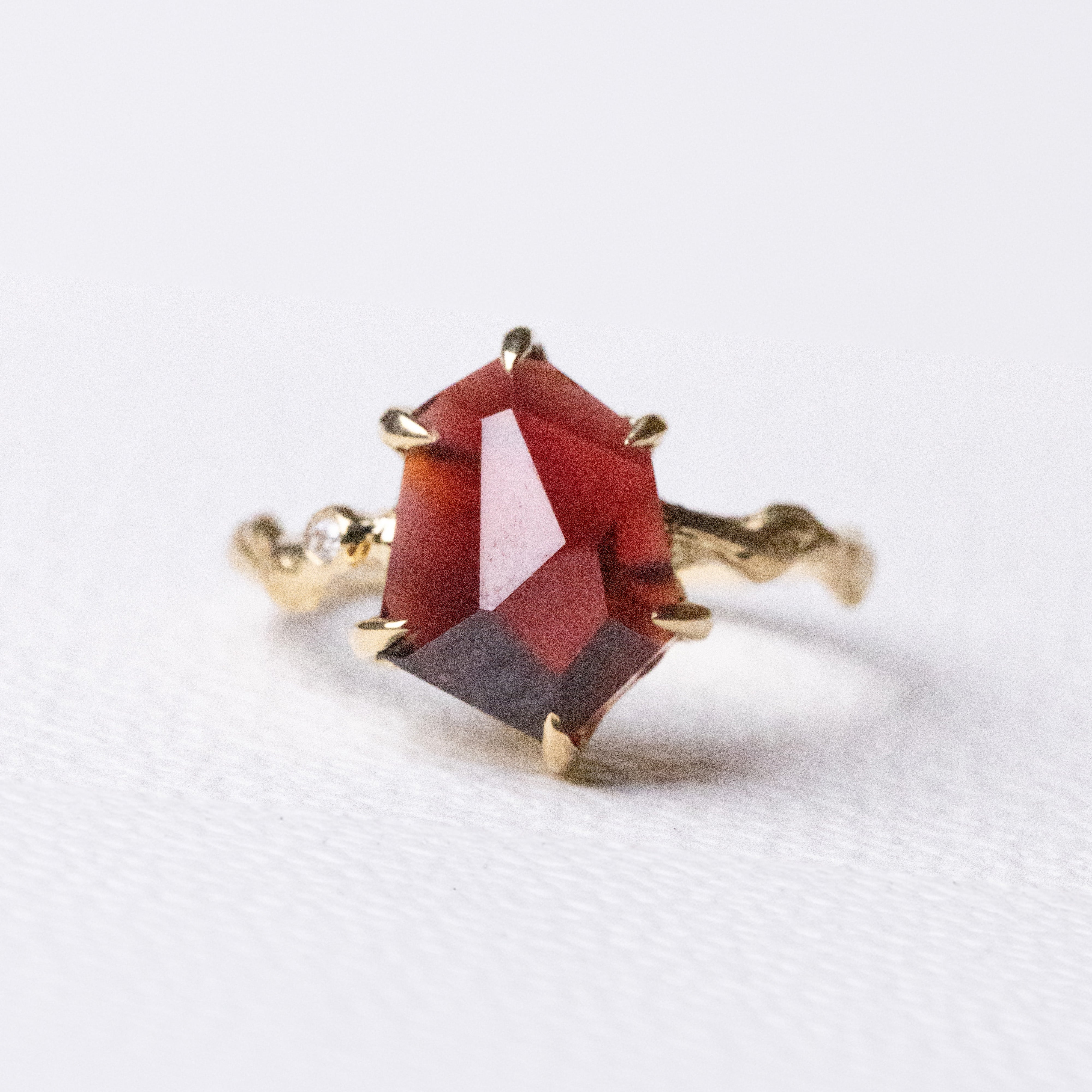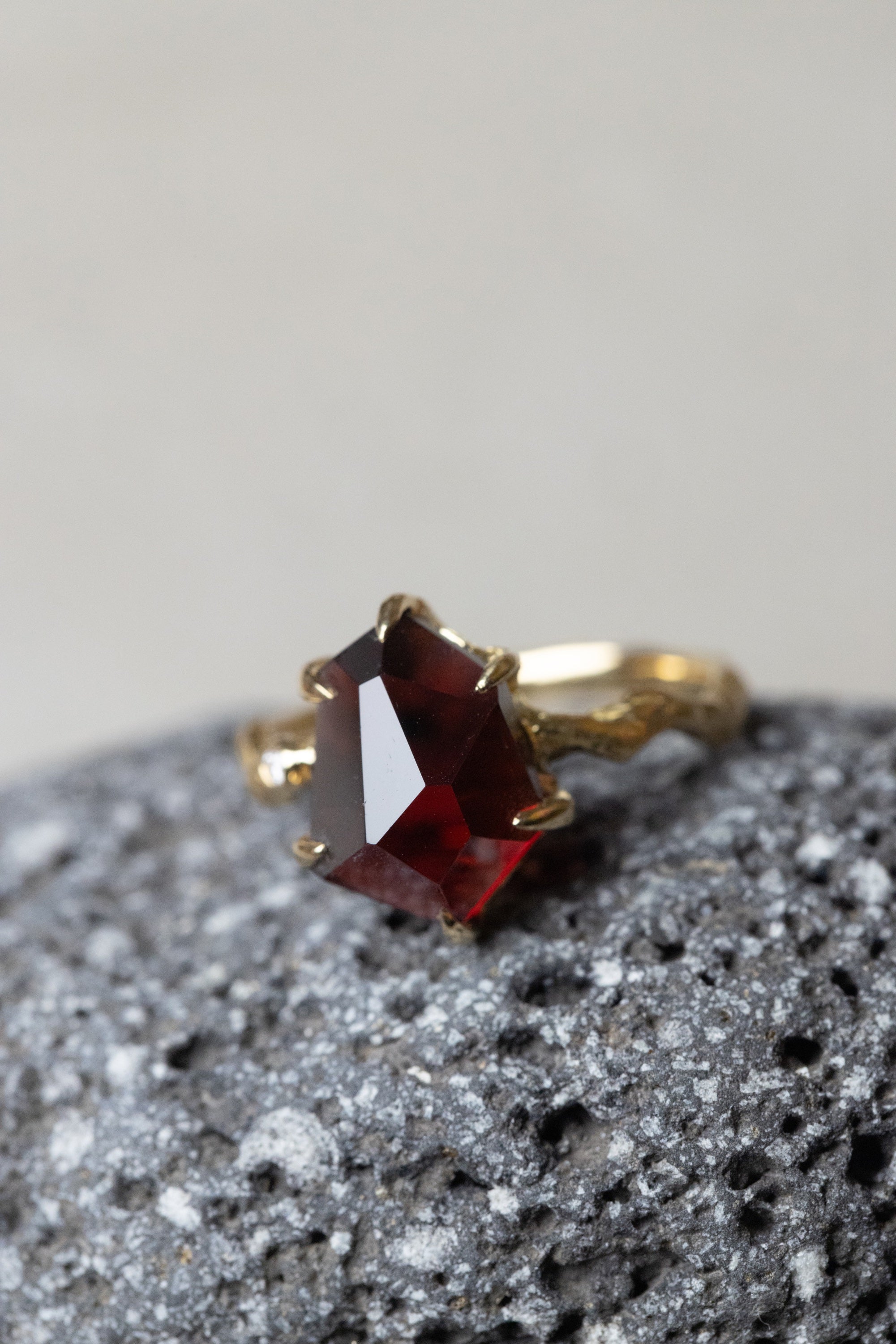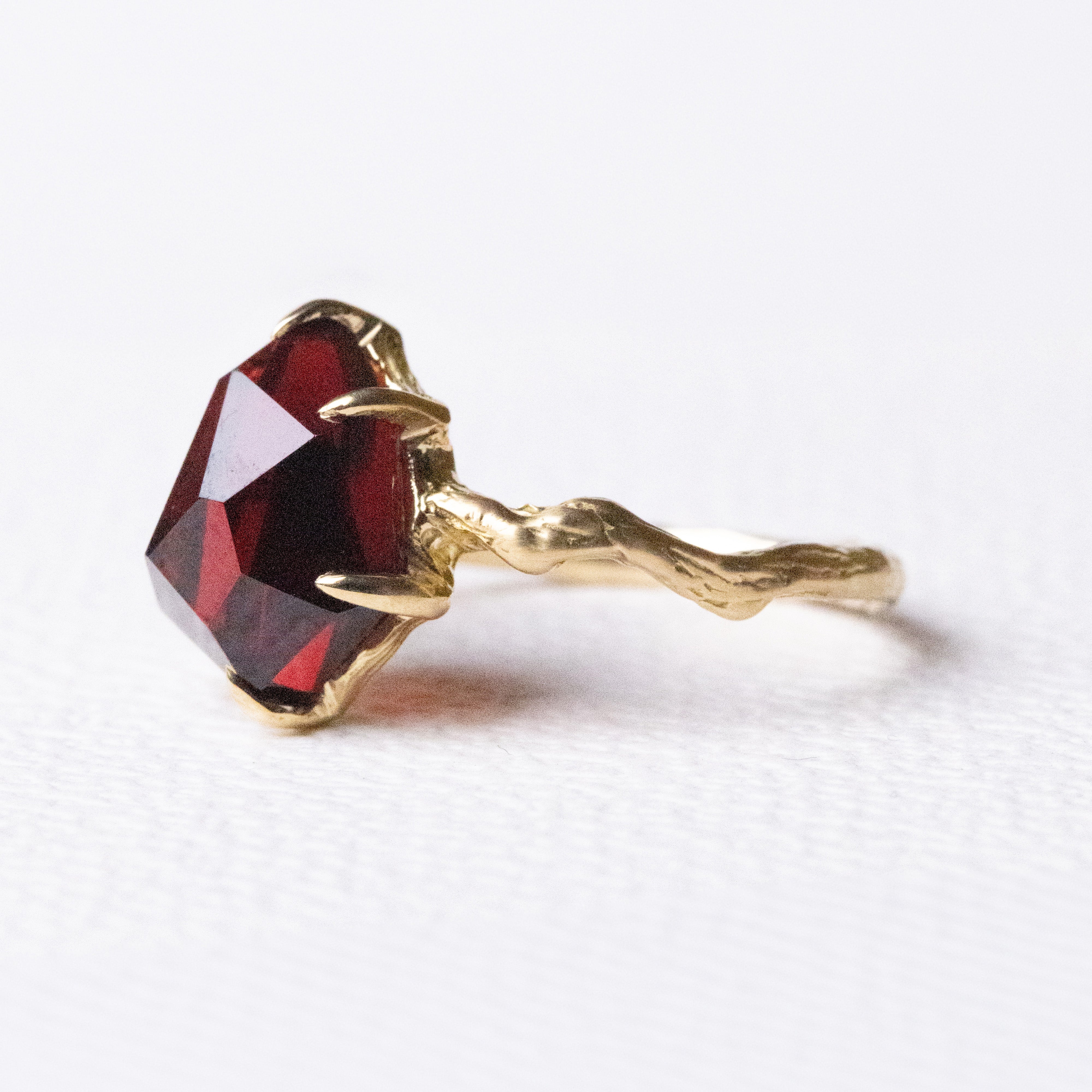自然のかたちの中に、きちんと磨かれた面の輝き。有機的なフォルムと、シャープなファセット。その対比が、この指輪の静かな個性になっています。