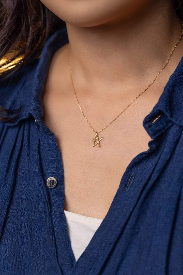 繊細な星をモチーフにしたこのネックレスは、一筆書き風のデザインが特徴的。実際には二度描いた線が重なり合い、線の太さや形状にわずかな違いが生まれることで、星の表情に奥行きを与えています。マット仕上げの優しい質感とオープンなデザインが相まって、軽やかさと繊細さを同時に楽しめます。デザインは控えめなサイズ感で、日常の装いに自然に溶け込む一品です。