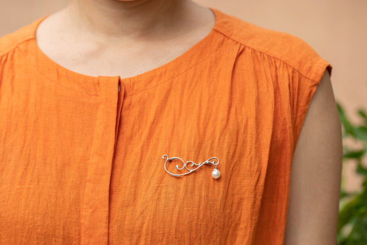 唐草をあやつって形作られた、流れるようなラインが美しいエレガントなブローチ。先端にアコヤ真珠を揺れるようにつけました。縦、横、斜めにブローチの傾きを変えれば、真珠の揺れ方も変わります。ニットやコート、ハットやバッグなど、使い方は色々。ギフトにも選ばれています。真珠は自然のままの凹凸がある、小さなお花のつぼみのようなバロックパールです。