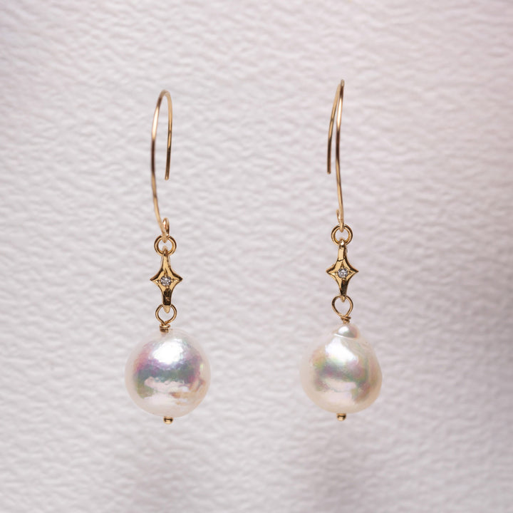 無調色のマルチカラーアコヤ真珠を使ったピアスです。柔らかなグレーや淡いピンク、時には黄色が見え隠れする自然な色合いが、耳元を上品に彩ります。星屑モチーフに留められた小さなダイヤがさりげない輝きを添え、デザインのアクセントに。同シリーズの星屑とパールのネックレスとセットで使うのもおすすめです。マルチカラーなので他のパールアイテムとのセット使いも、色を揃えなくてよいので簡単。一連のパールのネックレスのようなパールの大きさが違うものとの合わせも楽しんで。日常使いから特別な日まで幅広く活躍するピアスです。