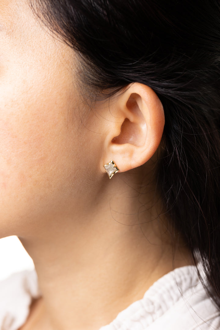 カイトシェイプ(凧型)のダイヤモンドを少しデフォルメしてスタッドピアスにしました。ダイヤモンドは、空気を含んだ氷のように、白く不透明な部分と透きとおった部分がある「アイシーダイヤモンド」。ダイヤはもともと、上部が短めの「菱形」。それに、ラインに強弱のあるゴールドのフレームで囲むことで、ラインをスマートに強調しています。シャープなダイヤの形、色と相まって、見る人にとってその形を「何か」にしてくれるようです。