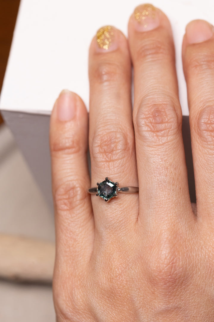 水をモチーフにしたアームに、六角形のティールカラー(青緑色)のモンタナサファイアを留めました。アームから伸びた爪も、オーガニックな形。少し丸みを帯びた爪が、シャープなカットとシェイプのモンタナサファイアをおさえています。