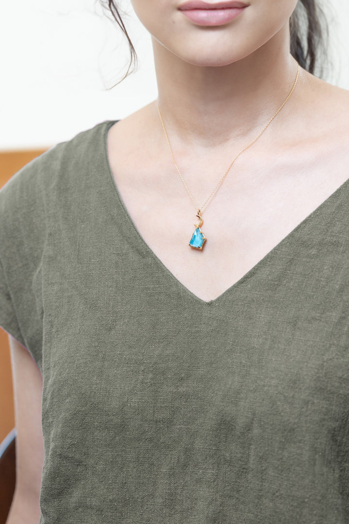 金色の針が見えるような「ルチルクオーツ」を、スライスしたターコイズを貼り合わせました。不透明で光沢はないターコイズも、高さのあるクオーツから光を取り入れてみずみずしいブルーに生まれ変わりました。K18の三日月を上に留めた、蒼黒い夜空のイメージとは違う、明るいブルーのネックレスです。