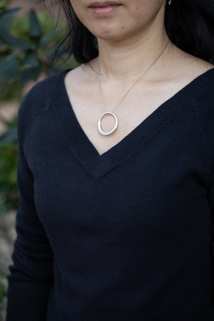 定番でシンプルなモチーフこそ、作り手の個性が活きるというもの。「輪(ループ)」の形もそのひとつ。内側の空間の中心をずらして丸みを均等にしていないことで、マット仕上げの放つ光と影をより繊細に表現しています。曲線で描いた輪、直線で描いた輪になっていて、両面で使えるリバーシブルのデザインです。チェーンはモチーフを通るように直接ついていて、「輪」の形を邪魔していません。いつものコーディネイトにワンポイントを作ってくれるネックレスです。小さいループのネックレスもあります。