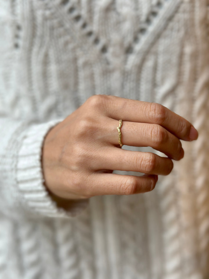 細い枝が指を一周しているようなリング。18金でも、マットな仕上げと木肌のテクスチャーで輝きをおさえ、ナチュラルな印象。普段ゴールドのジュエリーを選ばないかたも、シルバーのジュエリーと一緒に着けていただけます。リングの一ヵ所が浅めのV字になっているので、石が留まったデザインのものをそこにはまるようにつけるとフィット。17号までご用意しています。