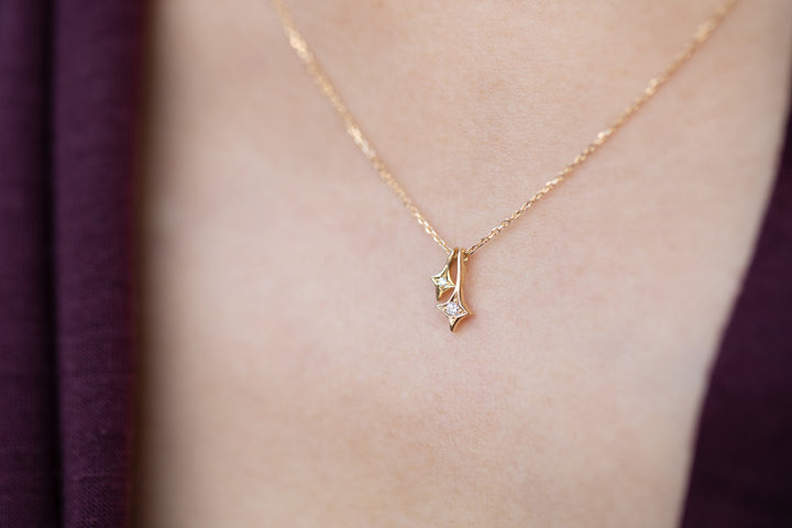 小さなダイヤモンドを2つ、寄り添うようにあしらったネックレス。シンプルだけど「ひとつ」ではなく、長さの違う星屑を並べました。上下に下がり、流れるようなラインを作りながらさりげない雰囲気に仕上がっています。小さな18金の粒でダイヤモンドを留め、それを囲む少し縦長のラインで星が放つ光のラインを表現しています。