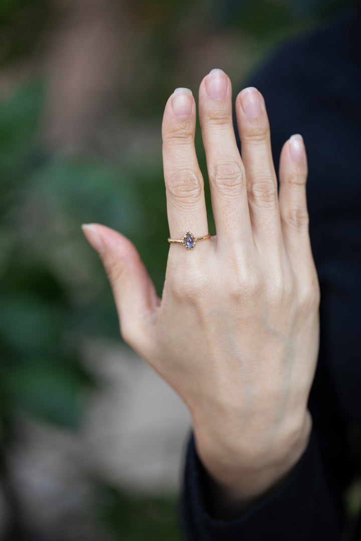 高さのある丸みがかわいい、透き通ったタンザナイト。インクリュージョン(内包物)がほとんど見えない、透明度の高い石を使いました。ドロップのカーブ、カボション型の高さが、小さな石に当たる光を回し、水滴のようにとてもきれいに光ります。石を囲む小さな粒が、小さめのモチーフのシンプルなリングを少し賑やかにしています。