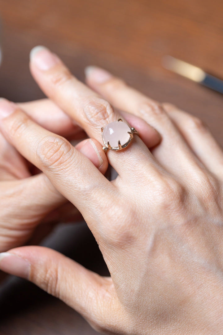 インクルージョンもある、ナチュラルな雰囲気のローズクオーツ。リングはテクスチャーのついた自然な風合いで、ローズクオーツの薄いピンク色になじむ10金ピンクゴールド製。マット加工にして輝きも合わせました。