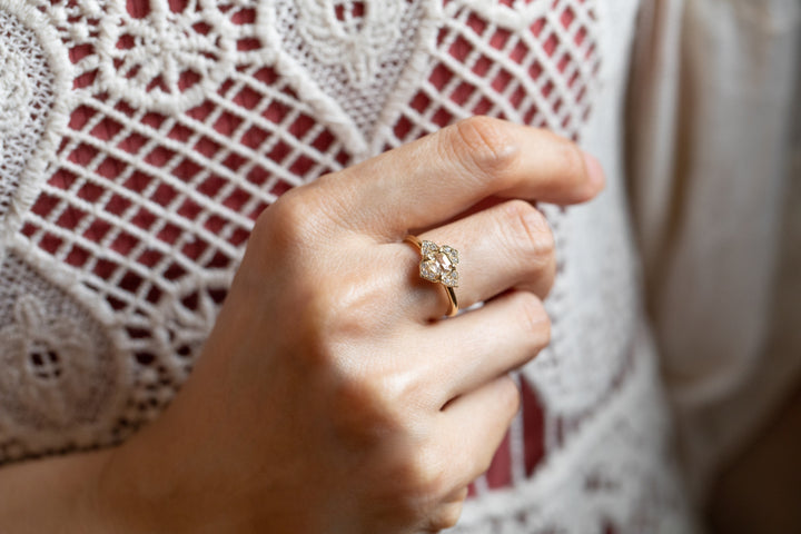 中心は楕円形のローズカットのダイヤモンドで、その周りに小さなダイヤが縁どるようなデザイン。4枚の花弁のように囲み菱形になって、目を引く大きさのモチーフにしました。「Halo (ハロー)」とは、「後光」や「光輪」のこと。「ハローリング(ヘイローリング)」は中心の宝石を小さなダイヤモンドやが取り囲むのこと。中心の宝石をより大きく、より輝かせる効果を持っています。アームから高さを出してついているところも、立体的な可愛さへのこだわりです。