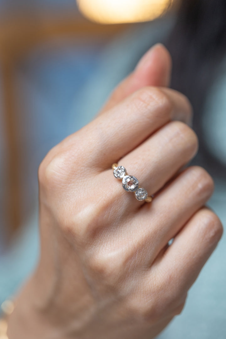 ローズカットのダイヤモンドを3つ、脇のダイヤは少し小さなものにしてプラチナに留めました。リングの部分はイエローゴールドで、木肌のようなナチュラルなテクスチャーで、みずみずしいダイヤを支えているように素材感にコントラストをつけたデザインにしました。