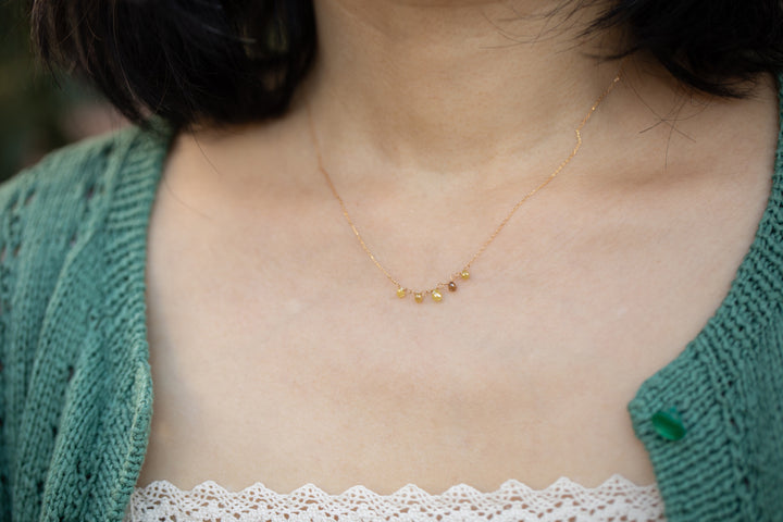 小さなナチュラルダイヤモンドが5粒並んでいます。真ん中のダイヤがほんの少し大きいものにし、5粒それぞれ色が少しずつ違います。少しブラウンがかっているものも。チェーンだけでは寂しいけれど、アクセントと個性が欲しい時に選んでいただきたいネックレスです。チェーンはカットの施されたものを使用。細くてもキラキラと優しく輝きます。