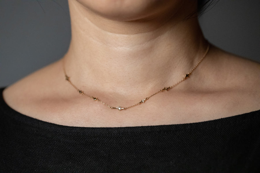 チェーンに並べられた7つの星。肌が見えるもの、ダイヤを留めたものがある、小さな個性が見え隠れするステーションタイプのネックレスです。