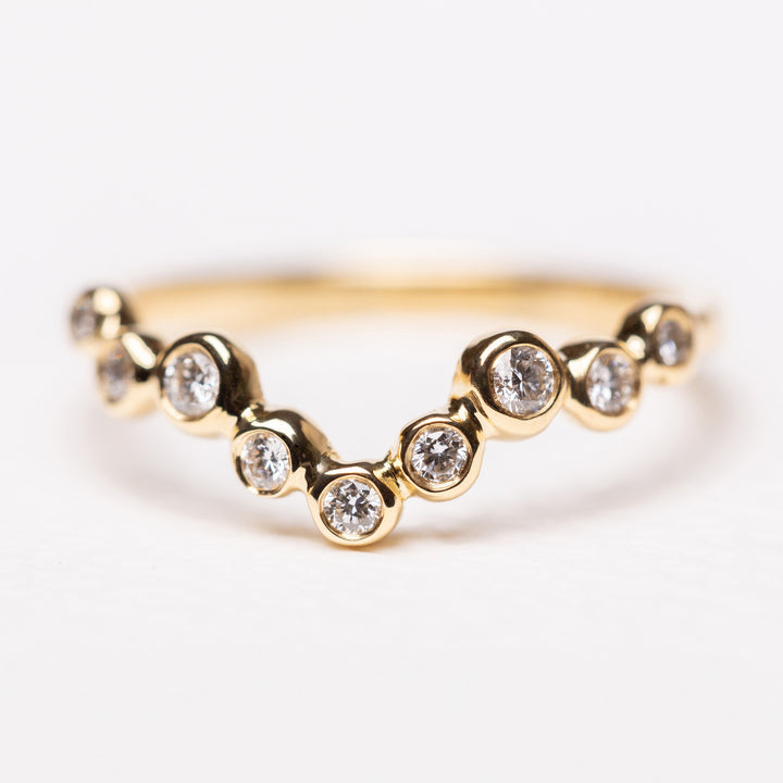 左右対称のシャープなV字ではなく、ドットを並べたオーガニックなラインでダイヤモンドを配置。大小さまざまなダイヤがセットされており、光を受けてさりげない輝きを放ちます。「爪」を使わずに石を留める「覆輪留め(ふくりんどめ)」の手法でダイヤを留め、ダイヤのそれぞれの大きさをリズミカルに強調。他の石付きのリングとの重ね付けにフィットし、さまざまなスタイルに合わせやすいリングです。