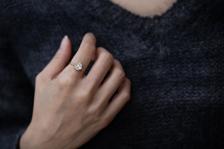 ムーンストーンの中でも少し青みがあり、その中でも透明感にある「ブルームーンストーン」。半月型で正に月のようなリングです。18金の爪と枠でしっかりと留め、丸みがあってもかわいいだけではないリングに仕上げています。脇に留めたダイヤモンドは星のよう。真っすぐではなく、少し斜めにしてあるところも、月に見えるようにしたMayaのこだわりです。
