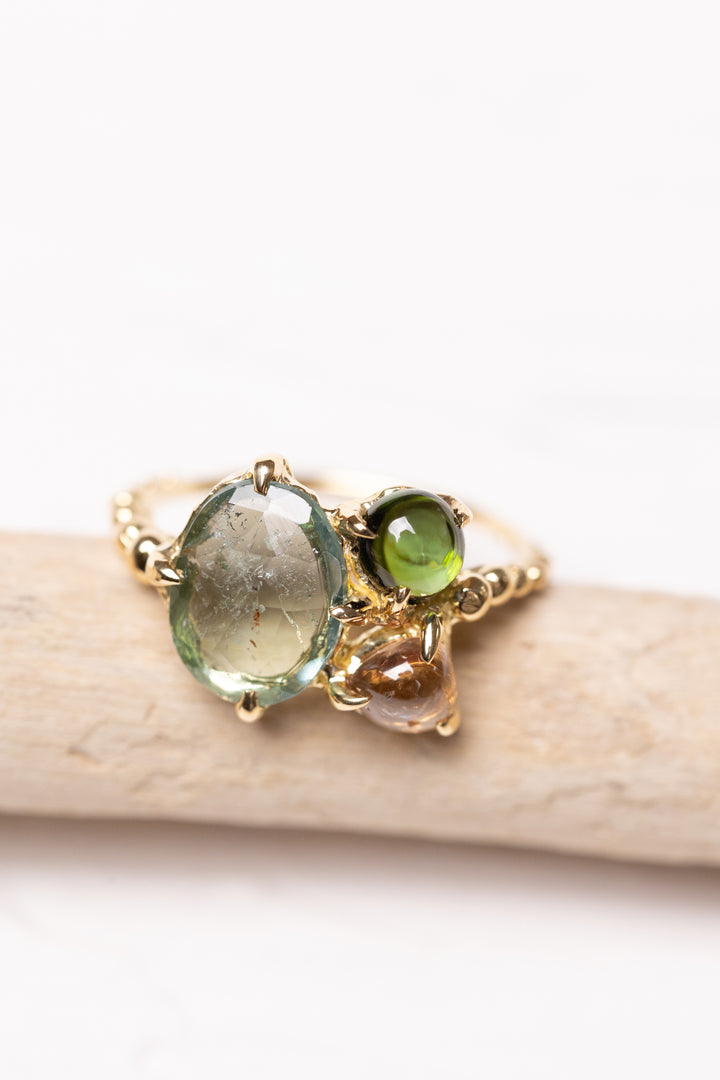 肌に重なると少し色が濃く見える、グリーンがかった大きめのトルマリン。平たく、色や内包物がよく見え、天然石の個性がわかります。隣にはつるんっとした丸さと高さが瑞々しい小さなトルマリン。この2色と相性の良い、ピンクがかったアプリコット色の石がサファイアです。カットされてきらっと光るものと、滑らかな質感のものを合わせた、色も輝きも楽しい、手作りのキャンディーのようなリング。アームの部分は小さな粒を並べました。