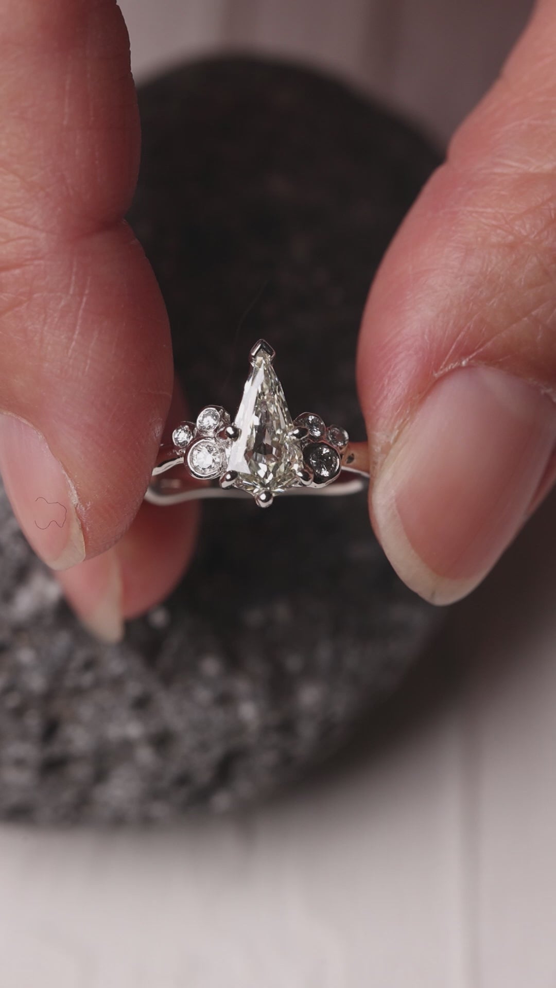 細長いペアシェイプのダイヤモンドは、よく見るとステップカットが施されています。細かくラインが入り、ジオメトリックなラインを描く光が、ペアシェイプの輝きを内側から強調するような輝きです。
