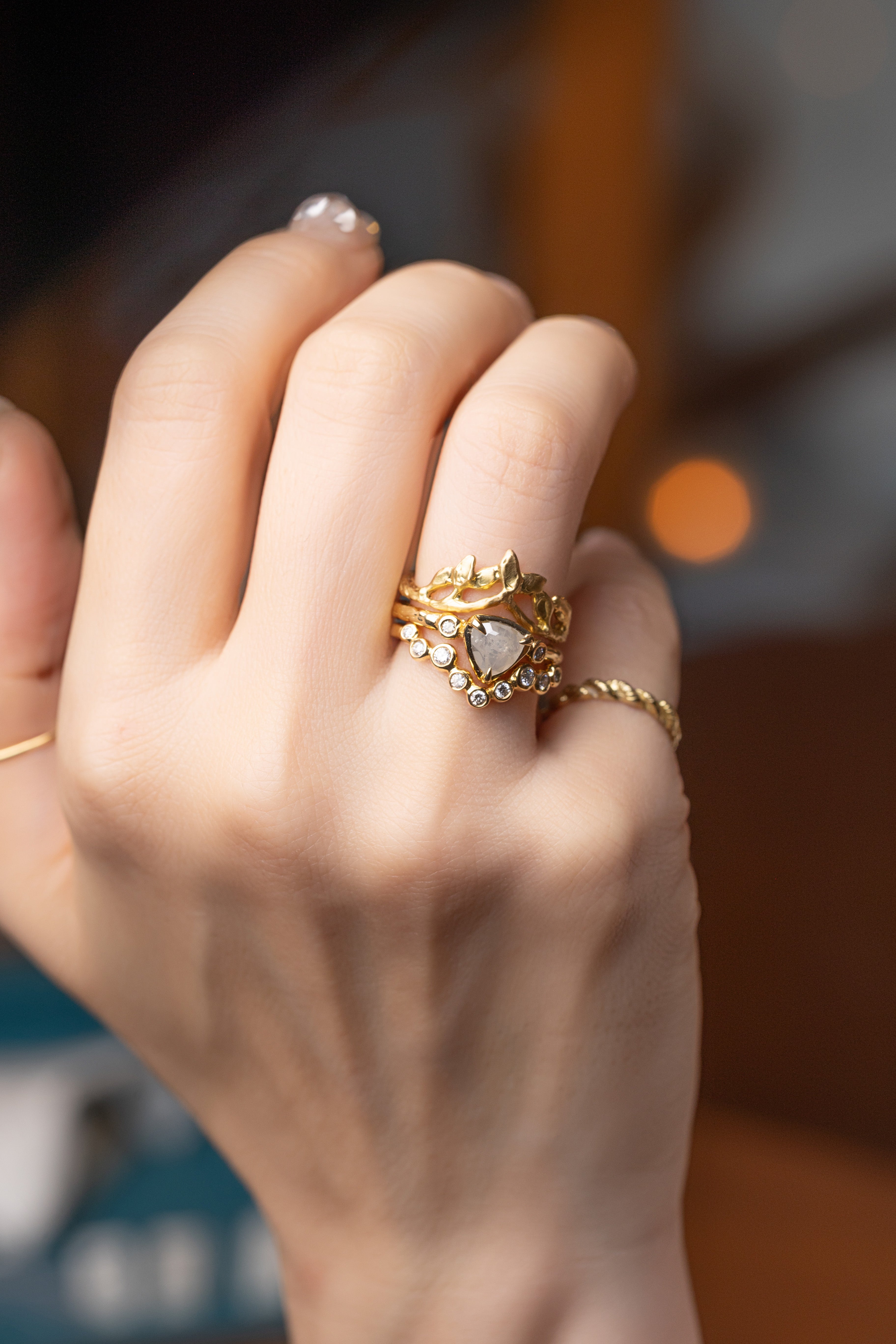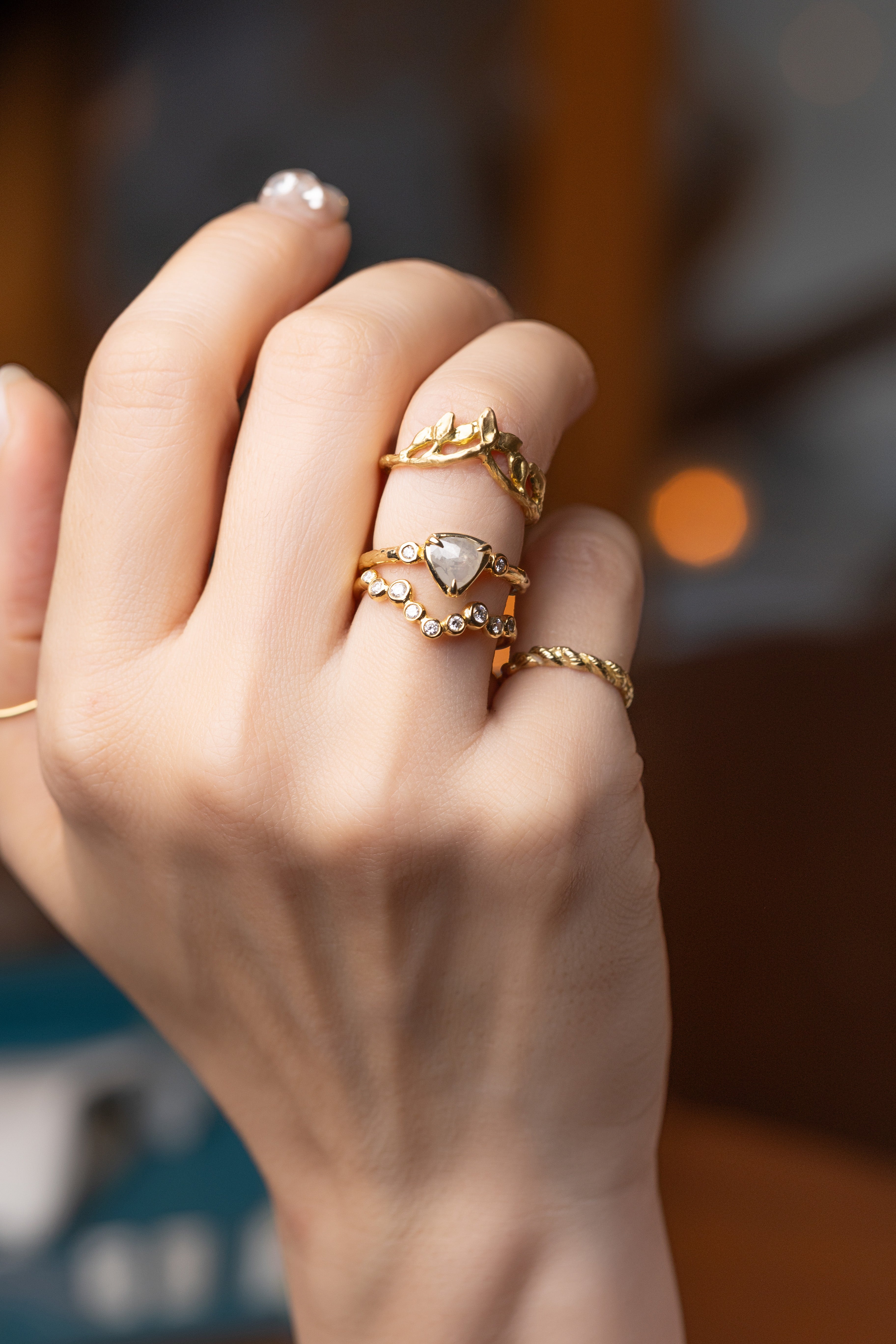 三角のフォルムにカットされたダイヤは、氷のかけらのようにどこかやわらかく、ひんやりとした存在感を放ちます。下辺がまっすぐなので、他のリングと重ねても心地よく馴染み、指先にさりげないリズムを作ります。