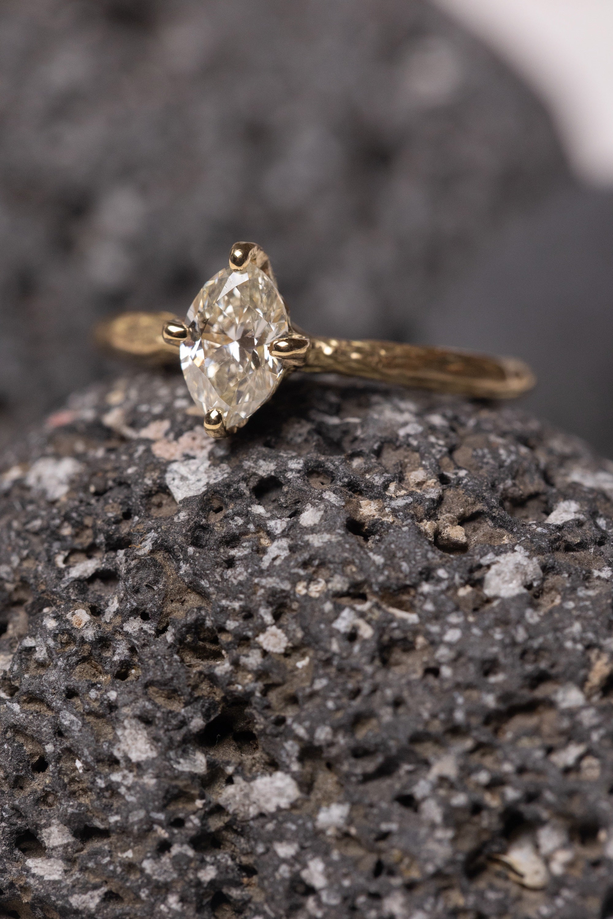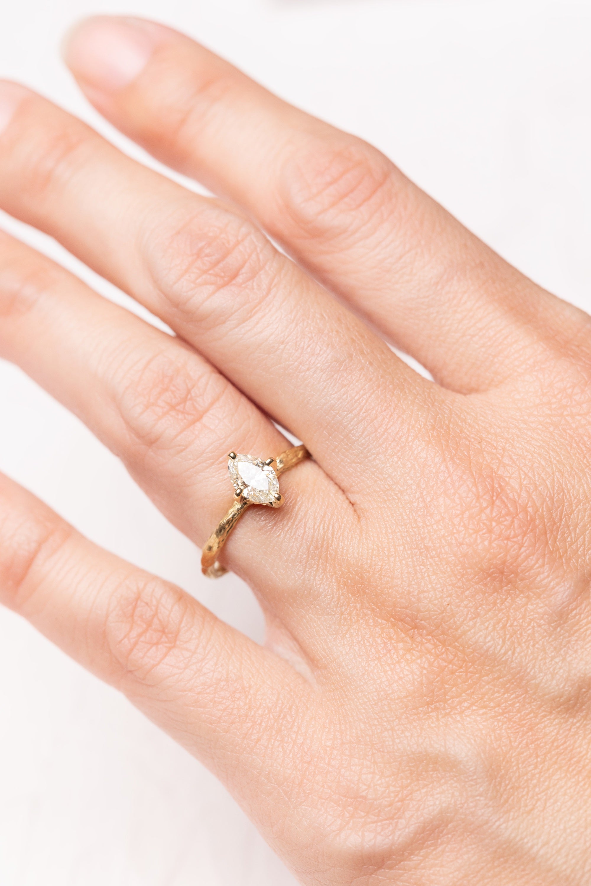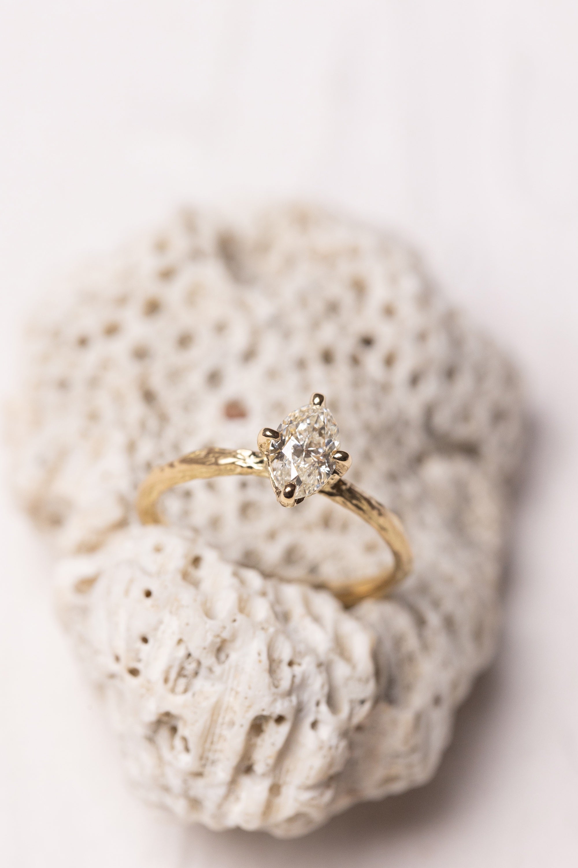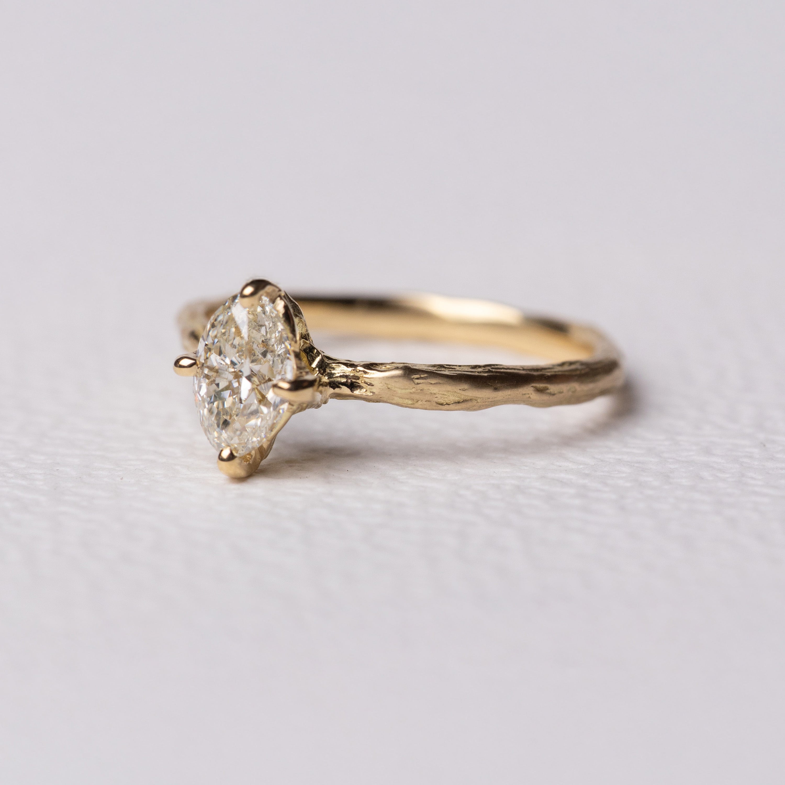 ダイヤモンドは、すっきりとした印象のマーキスシェイプ。4点留めでまとめることで、石そのものの輪郭と輝きが素直に伝わってきます。