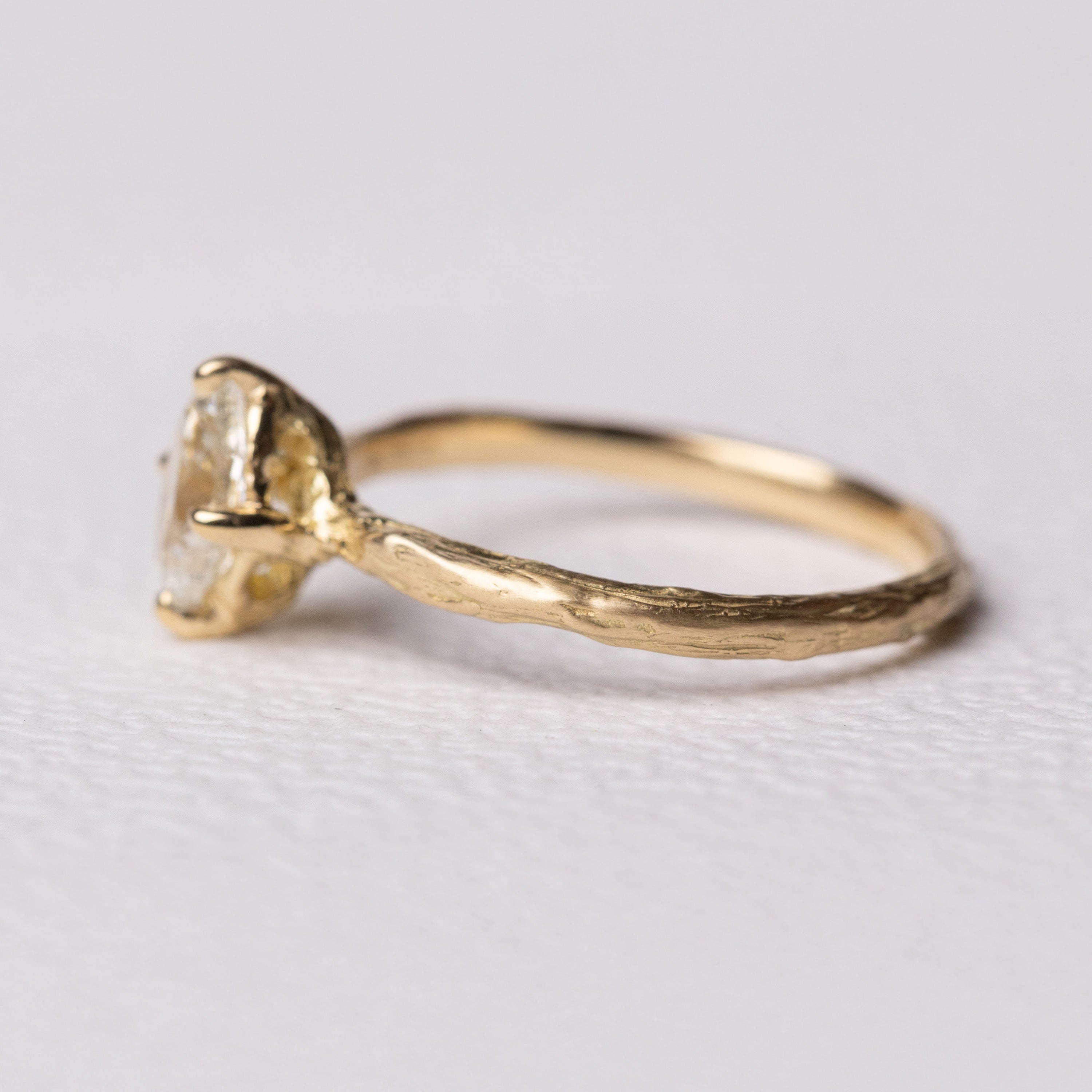 ダイヤモンドの凛とした輝きと、自然物のような揺らぎ。相反する要素が同居しているからこそ、日常の装いにもすっと馴染み、長く身につけたくなるリングになりました。