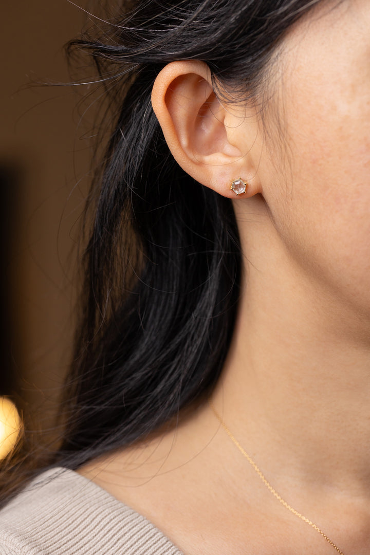 六角形にカットされたダイヤモンドをピアスにしました。表面のカットが光を反射して、動くたびにキラキラと輝きます。透明の六角形は雪の結晶を思い出させる形。肌が透け、より光を集められるよう、ピアスのポストは六角形の頂点の裏につけました。高い透明度で透き通っていながら、インクルージョンも入っているのが見える、ileavaの森の冬の湖で見つけたようなナチュラルダイヤです。普段シルバーしか選ばないかた、男性にもお勧めです。