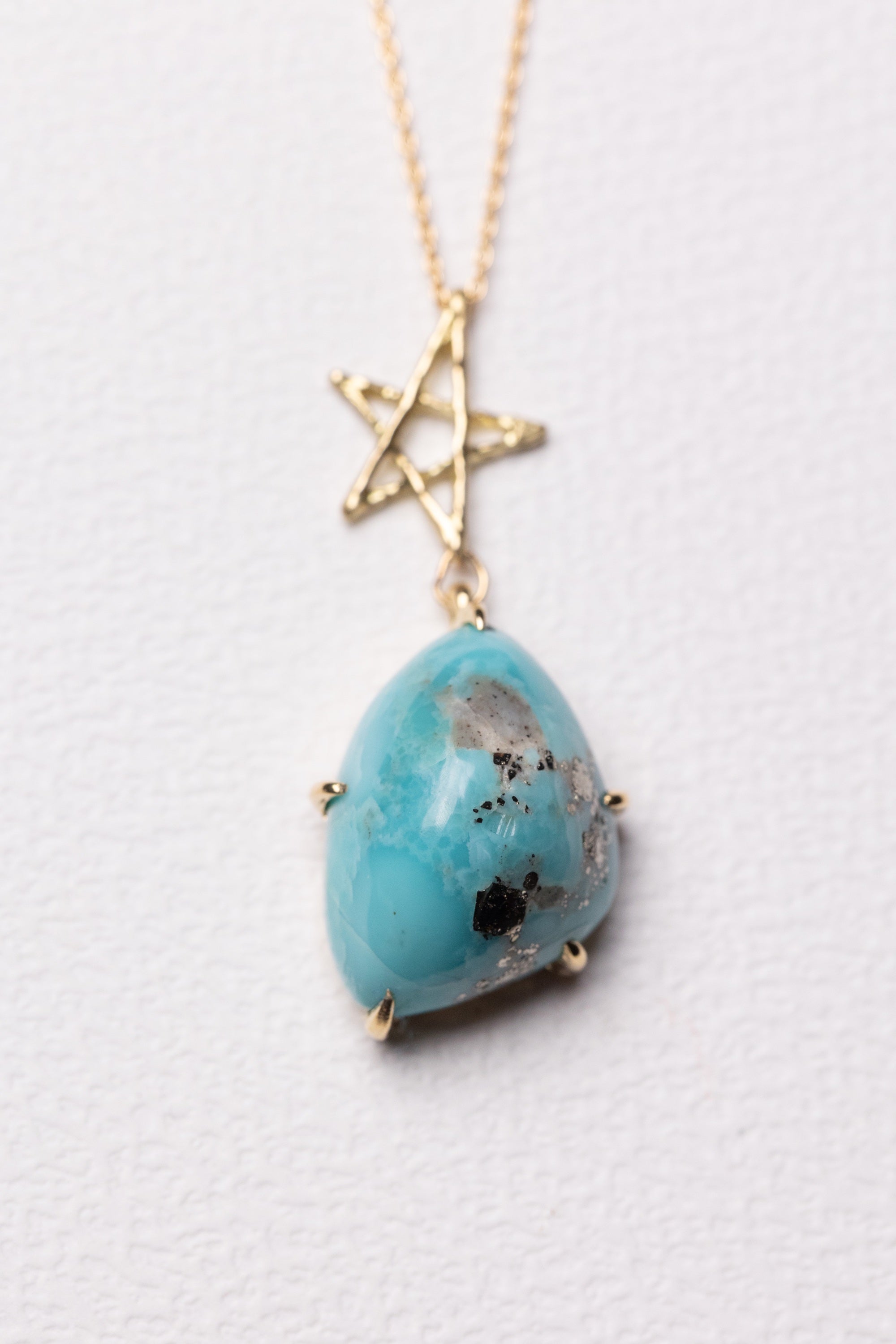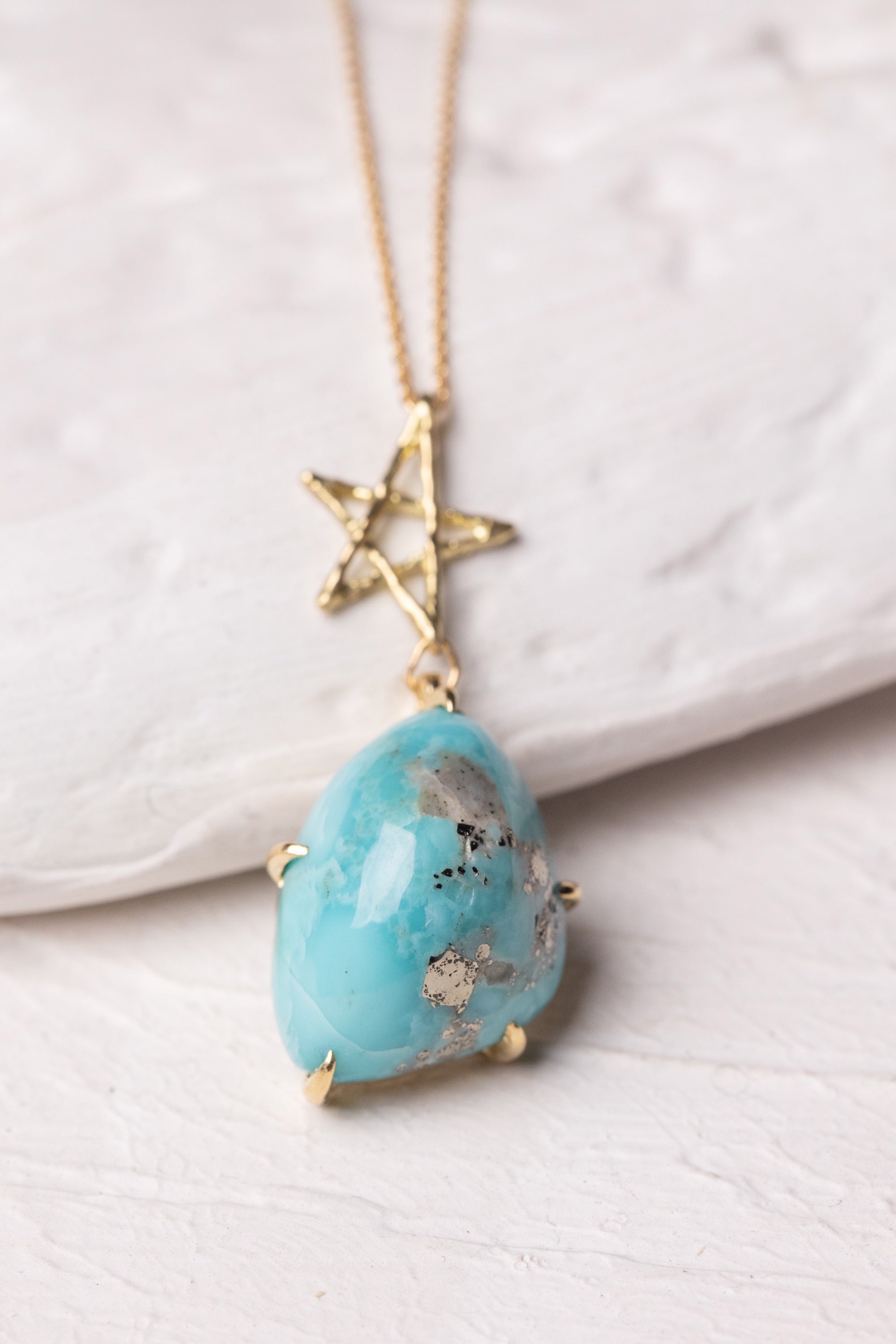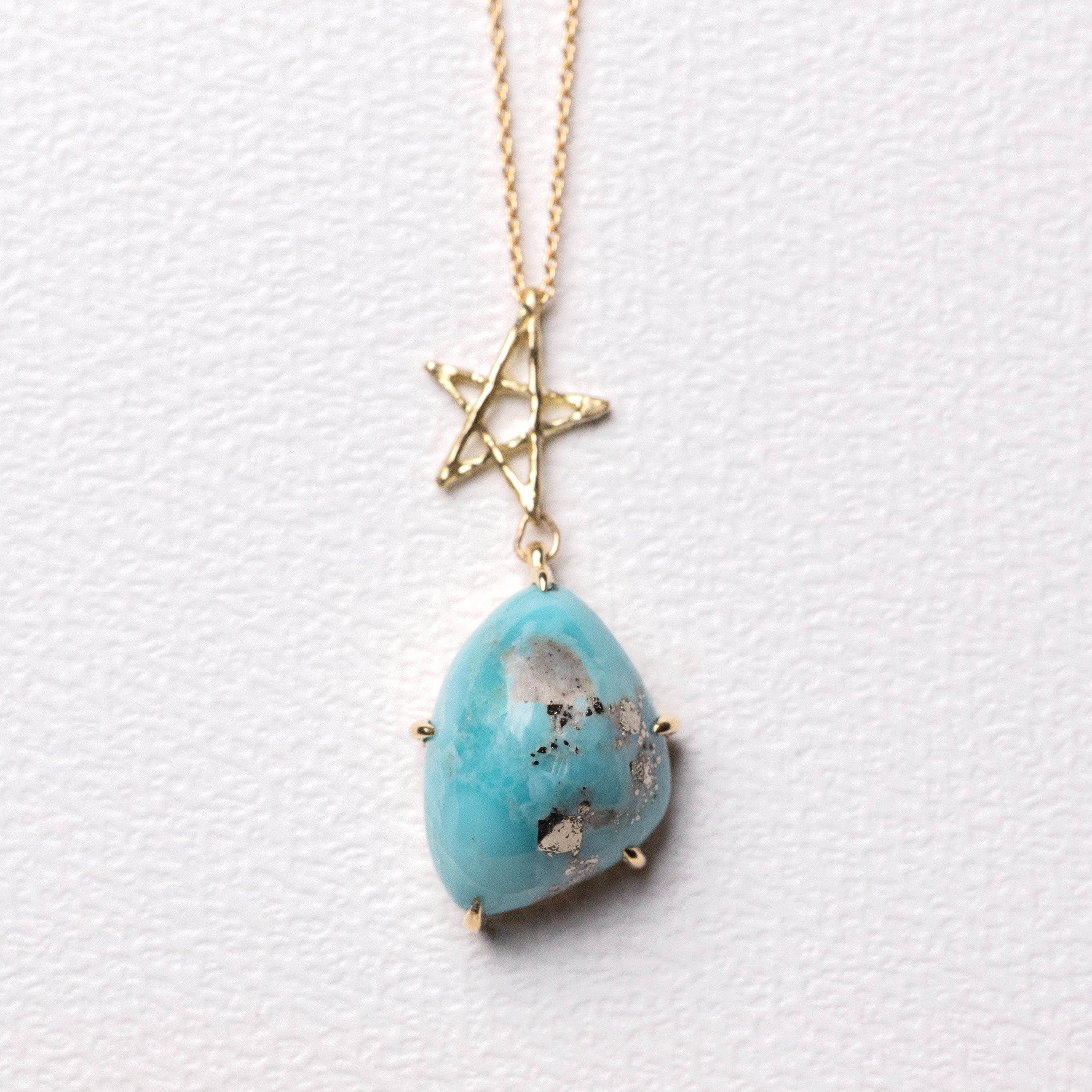 一筆書きの星からぶら下がるごろっとしたパイライトターコイズのネックレス