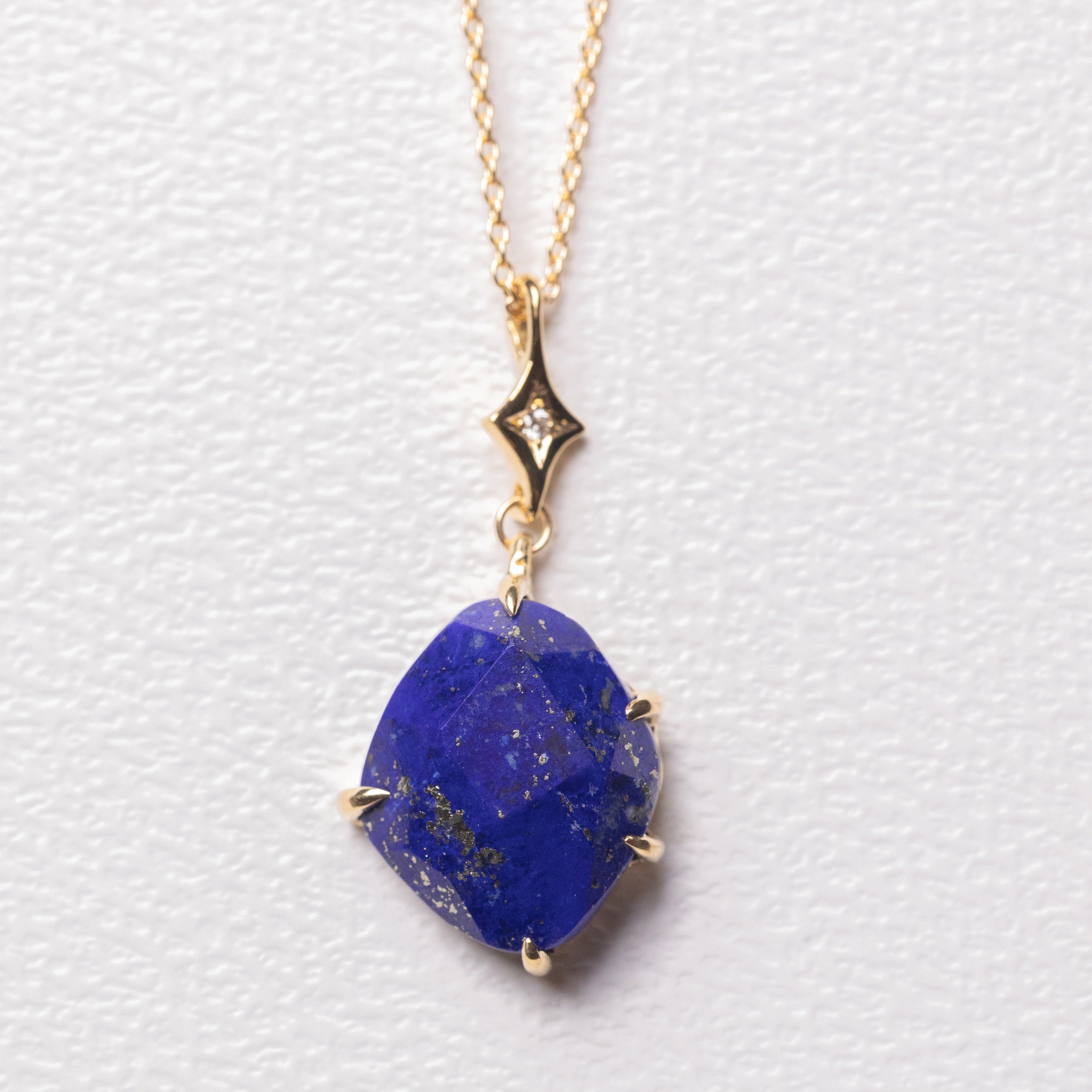 クラシックな星の下で、ラピスの青とパイライトのきらめきが揺れるネックレスです。