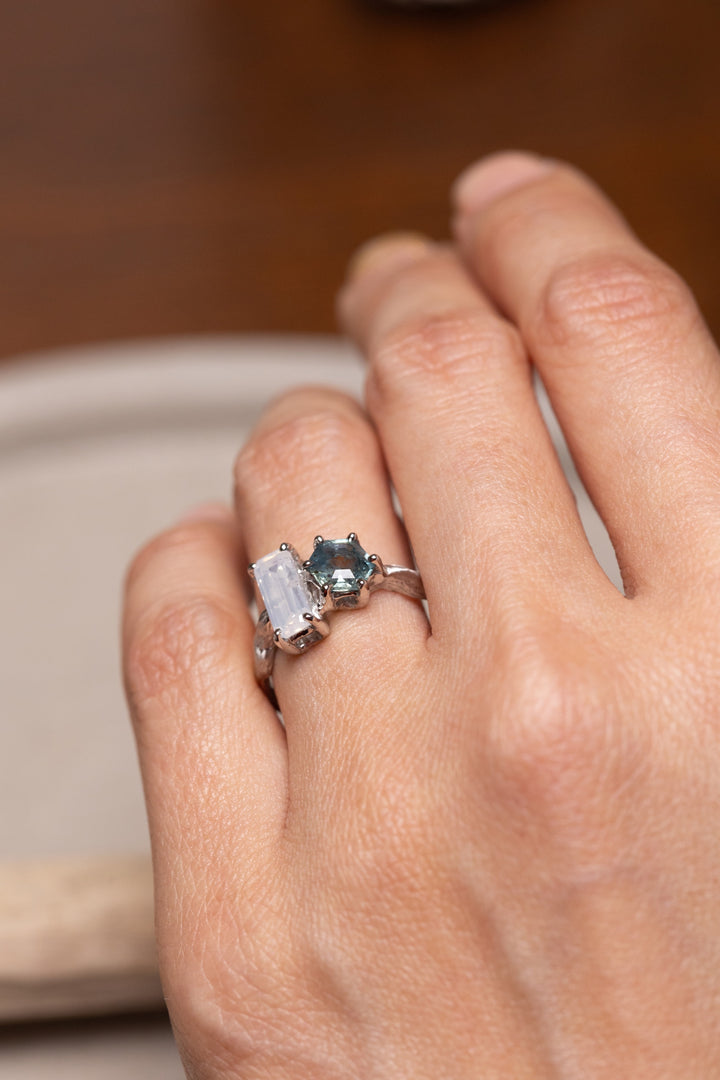 薄いティールカラー(青緑色)のモンタナサファイアは、六角形が際立つ「ステップカット」。寒色のサファイアの涼し気な色を、シャープな輝きで表現します。インクルージョン(内包物)もあり、自然の美しさを手元に留めます。ファンシーホワイトダイヤモンドは、ダイヤでありながら意外性のあるミルキーカラー。サファイアとは違い、優しく、かわいい印象の、ミルキーホワイトです。水をイメージしたアームのデザインとプラチナの色にぴったりの2石です。